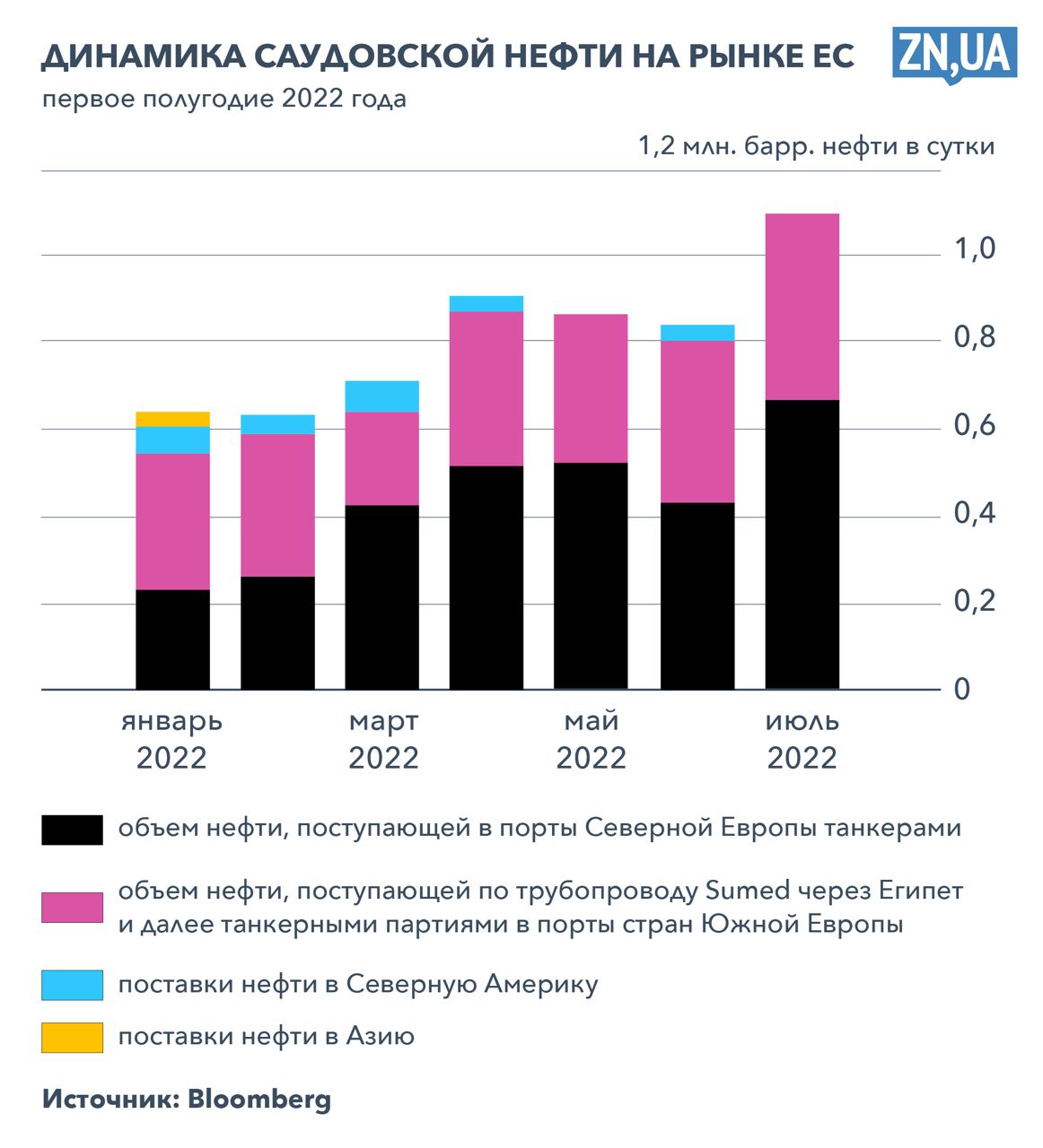 Динамика поставок саудовской нефти на рынок Евросоюза довольно впечатляющая за первое полугодие 2022 года. По подсчетам агентства Bloomberg, 1,2 млн баррелей нефти в сутки с Аравийского полуострова поступает в Европу по двум маршрутам — танкерами в порты Северной Европы (на рис. обозначено черным) и по трубопроводу Sumed через Египет и дальше танкерными партиями в порты стран Южной Европы (малиновым). Поставки в Северную Америку (синим) и Азию (желтым) практически обнулились. Также нарастает динамика поставок иракской нефти в ЕС.