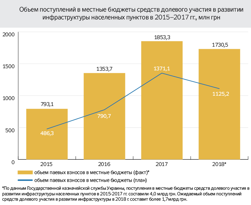 Анализ показал, что потребность в средствах на финансирование развития инфраструктуры громад значительно больше, чем поступления бюджета развития, и по этой причине ОМС значительную долю поступлений из общего фонда местных бюджетов направляют в бюджет развития. В целом в 2017 г. расходы местных бюджетов на капитальное строительство, капитальный ремонт, реконструкцию и реставрацию составили 33,3 млрд грн. То есть объем поступлений в бюджет развития недостаточен для финансирования всех потребностей инфраструктурного развития громад, и ограничение средствами от паевого взноса обусловит еще большее недофинансирование.