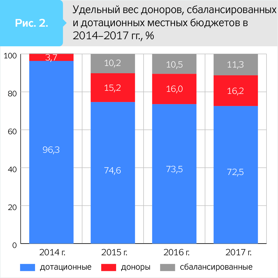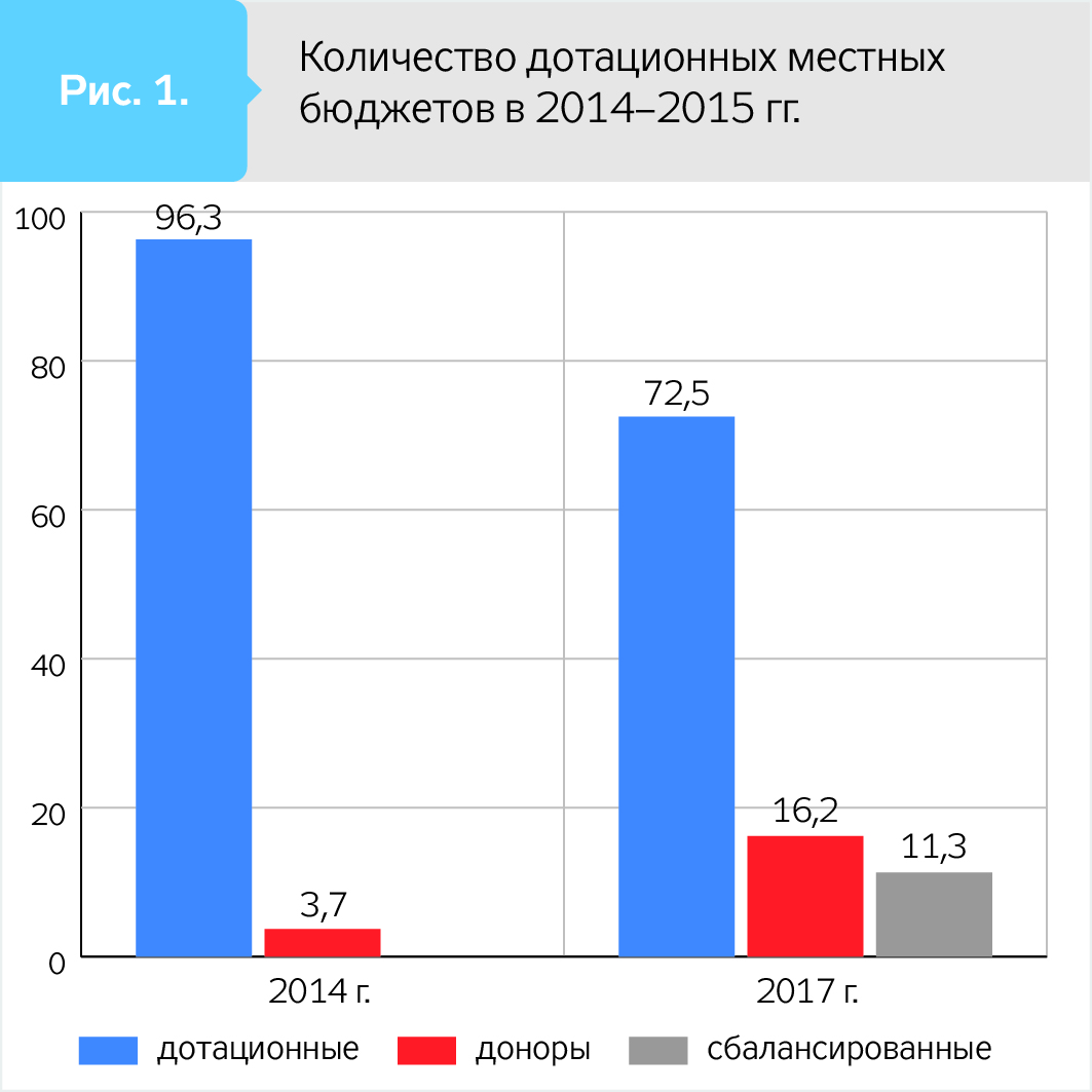 Изменение же механизма горизонтального выравнивания лишает громады мотивации наращивать финансовые ресурсы - чем больше ты зарабатываешь, тем больше у тебя заберут. Вместе с тем стимулирует иждивенческие настроения: зачем хорошо работать, если лучше ничего не делать и получить дотацию из государственного бюджета за счет других. Такая система действовала до 2014 г., когда 96,3% местных бюджетов были дотационными (см. рис.). Благодаря реформе ситуацию удалось изменить - местные бюджеты начали демонстрировать ежегодный рост. Не хотелось бы возвращаться в прошлое…