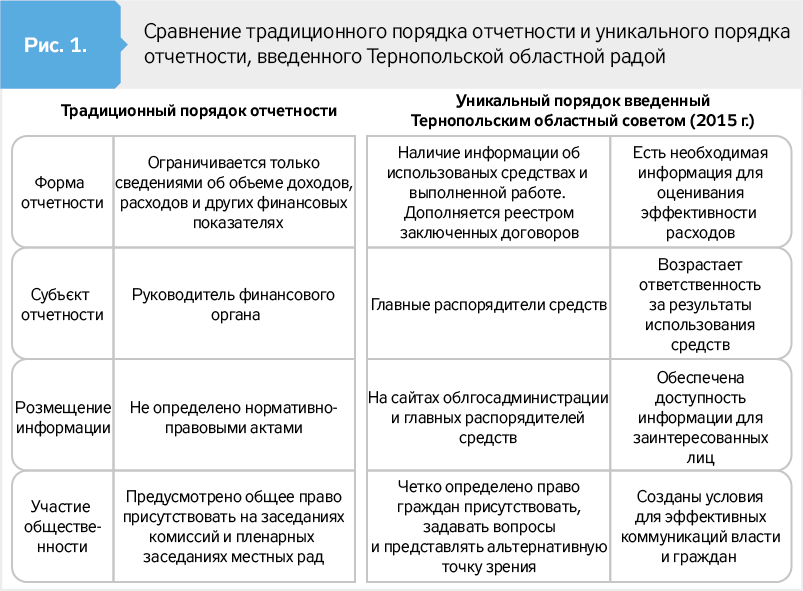 То есть благодаря инициативе общественности в Тернопольской области уже более года используют уникальный для Украины опыт публичной отчетности главных распорядителей средств областного бюджета. Принципиальные отличия введенного порядка отчетности по сравнению с традиционным приведены на рис. 1.