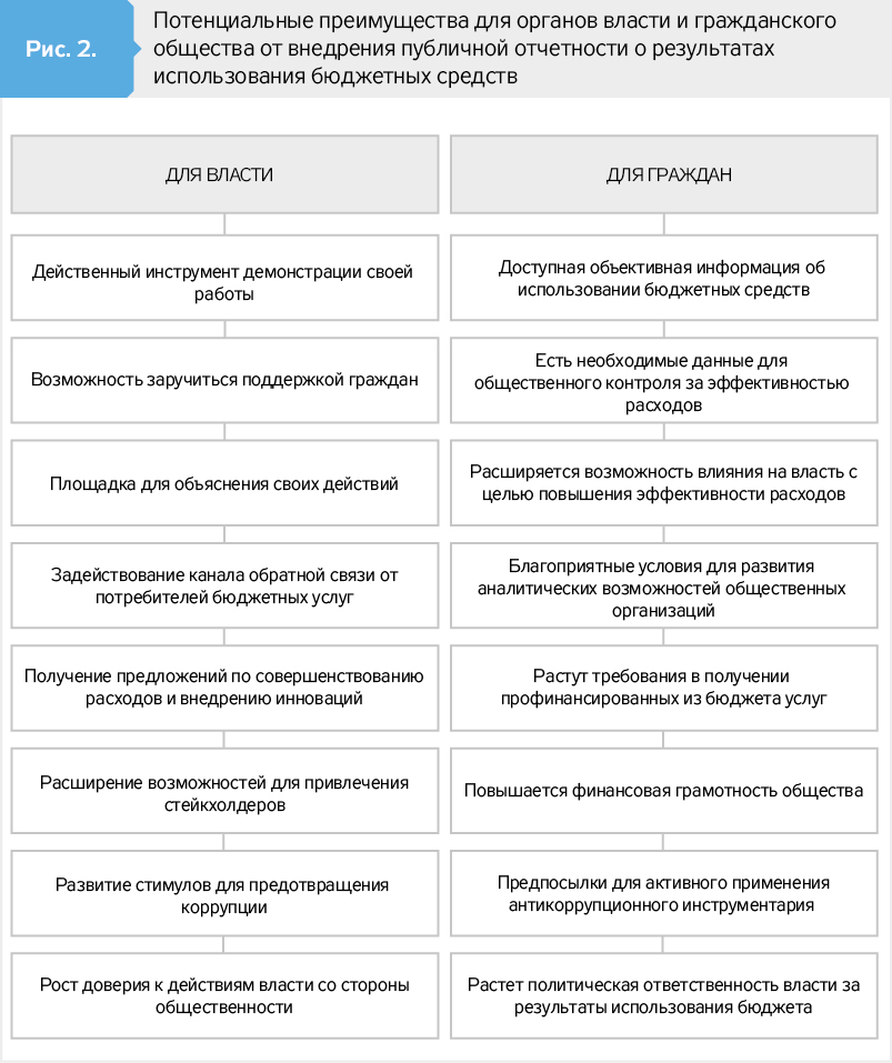 Сравнивая полученные результаты от внедрения публичной отчетности о результатах использования бюджетных средств с возможными потенциальными выгодами от этого механизма для органов власти и общественности, можно сделать вывод о том, что далеко не все его возможности реализованы.