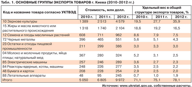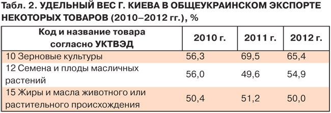Однако именно в 2012-м столица отправила за рубеж больше половины общеукраинского экспорта "семян и плодов масличных растений", "жиров и масел животного или растительного происхождения" и две трети выращенных на киевском асфальте "зерновых культур" (табл. 2).