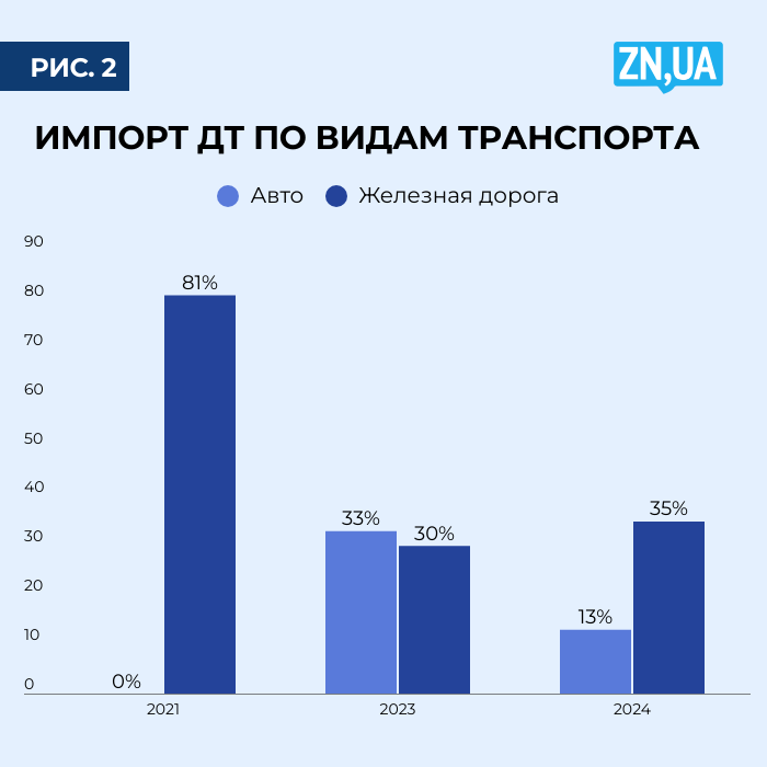 Дизтопливо — самое востребованное моторное топливо. В 2024 году его импорт вырос на 8%, до 6,65 млн тонн, что составляет 75% украинского импорта моторных топлив (кроме дизеля, это бензин и сжиженный газ). Другими интересными тенденциями стали сокращение источников поставок, количества импортеров и вместе с тем их укрупнение.