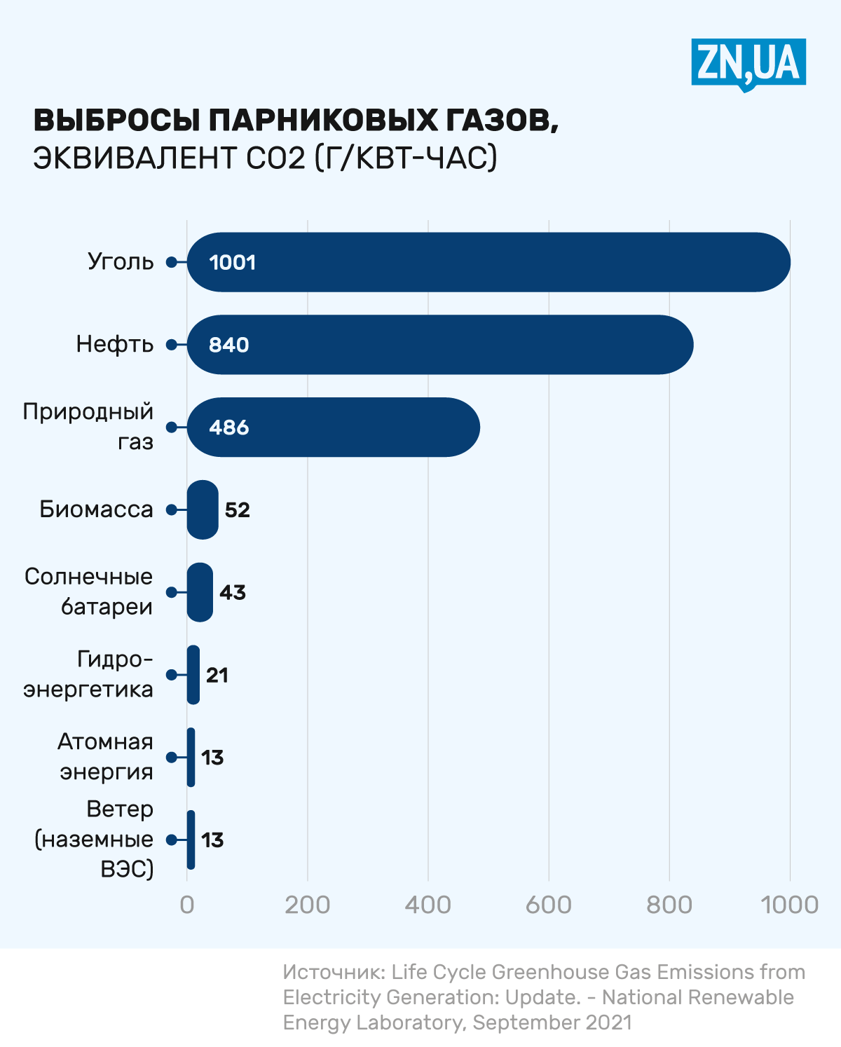Ниже указаны медианные показатели для разных видов генерации (медиана — это значения, которое делит выборку на 50% исследований с меньшими значениями и 50% с большими) (см. инфографику). Для атомной энергии приведены значения для легководных реакторов, которых в мире больше всего (этот тип ректоров сейчас используется и в Украине).