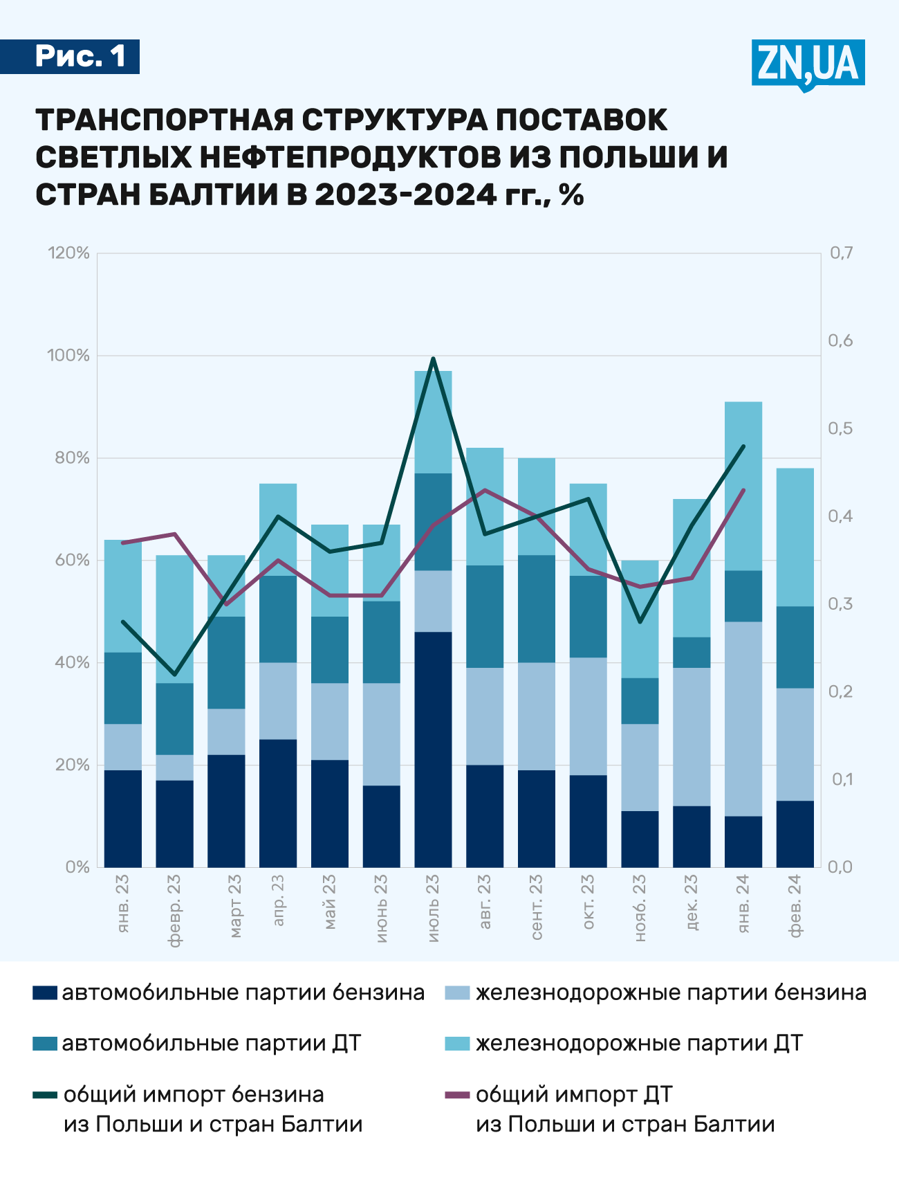 В ноябре 2023 года потребители дизтоплива и бензинов почти не заметили эффекта польских забастовок. В среднем по году через польскую границу в Украину заходило на автотранспорте 21% от общего объема бензинов (около 20 тыс. тонн в месяц) и 15% дизельного топлива (77 тыс. тонн) (см. рис. 1). Эти объемы были переброшены на другие границы или на железную дорогу.
