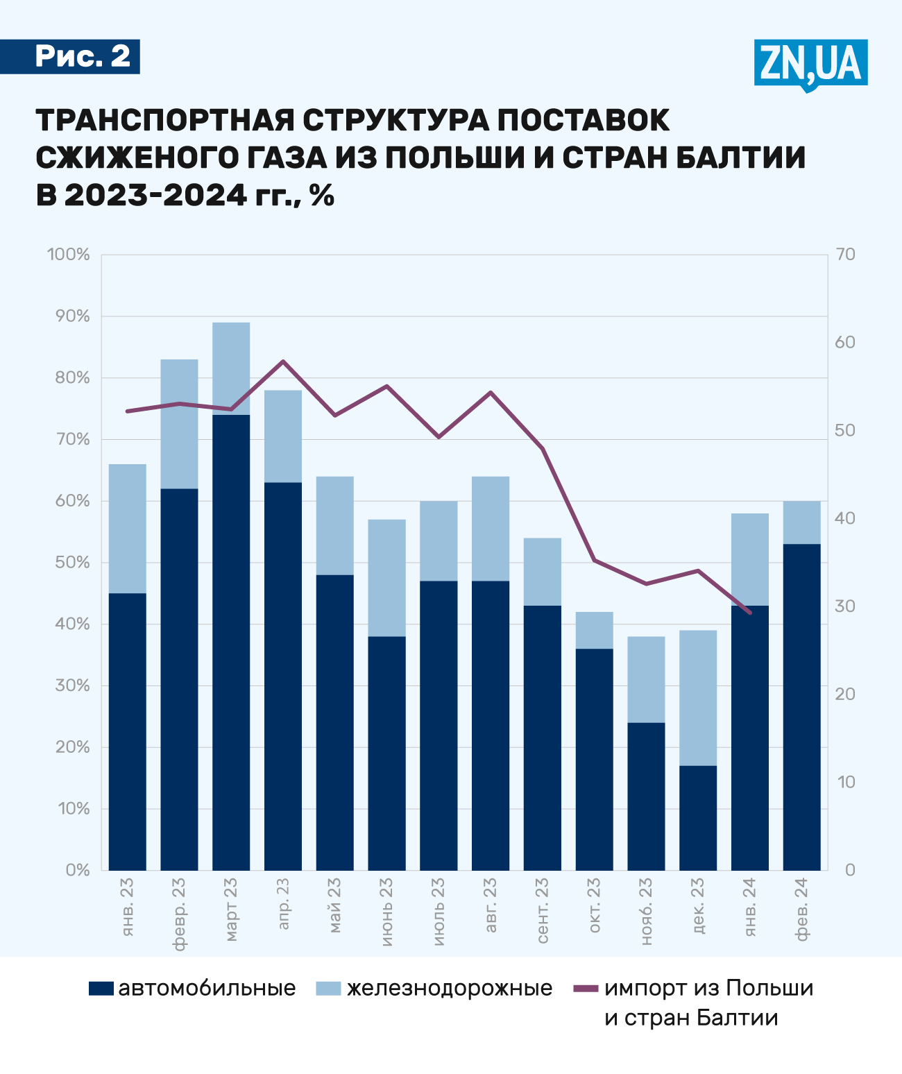 Импорт сжиженного газа более чувствительный к ситуации на польской границе. В 2023 году в среднем 30% импорта заезжало через польские автомобильные пограничные переходы. И если транспорта, который может ездить в Европу за дизтопливом или бензином, в Украине с излишком, то газовозов в разы меньше. Именно поэтому протесты фермеров привели к частичной дестабилизации рынка и взлету цен.