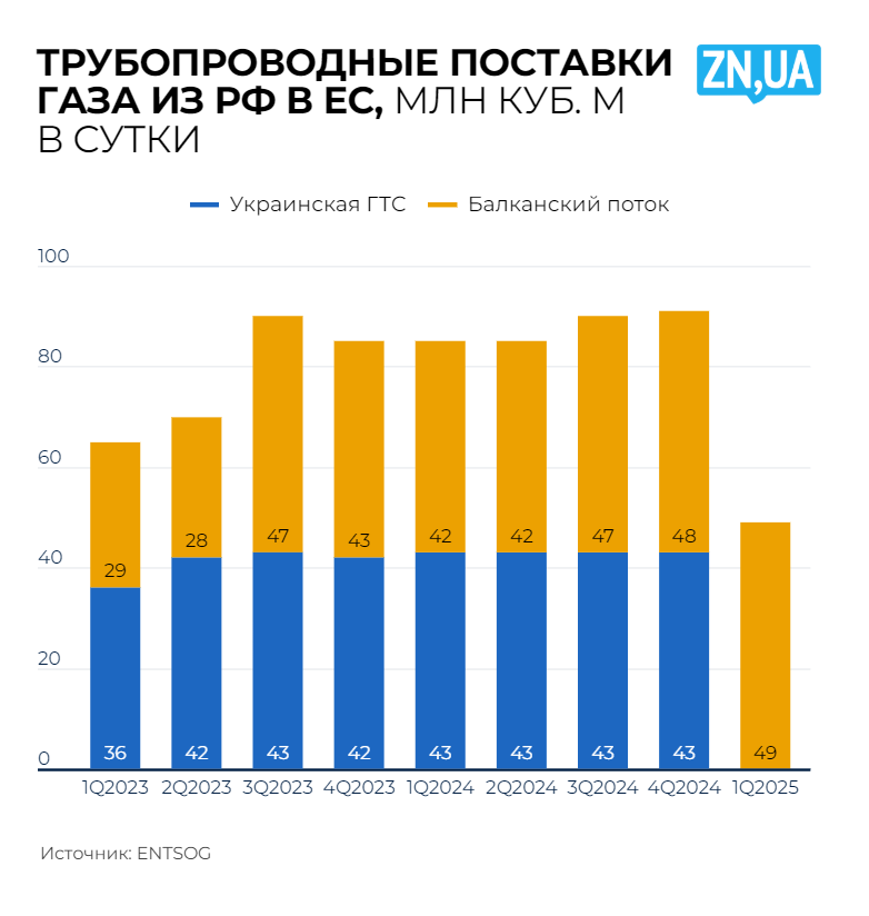 А что же в РФ? Россия не смогла компенсировать потерю украинского транзита, увеличив экспорт по другим маршрутам. Да, он незначительно повысился через европейскую ветку «Турецкого потока», но суммарный объем трубопроводных поставок газа из России в ЕС в первом квартале 2025 года был на 42% ниже, чем в первом квартале 2024-го.