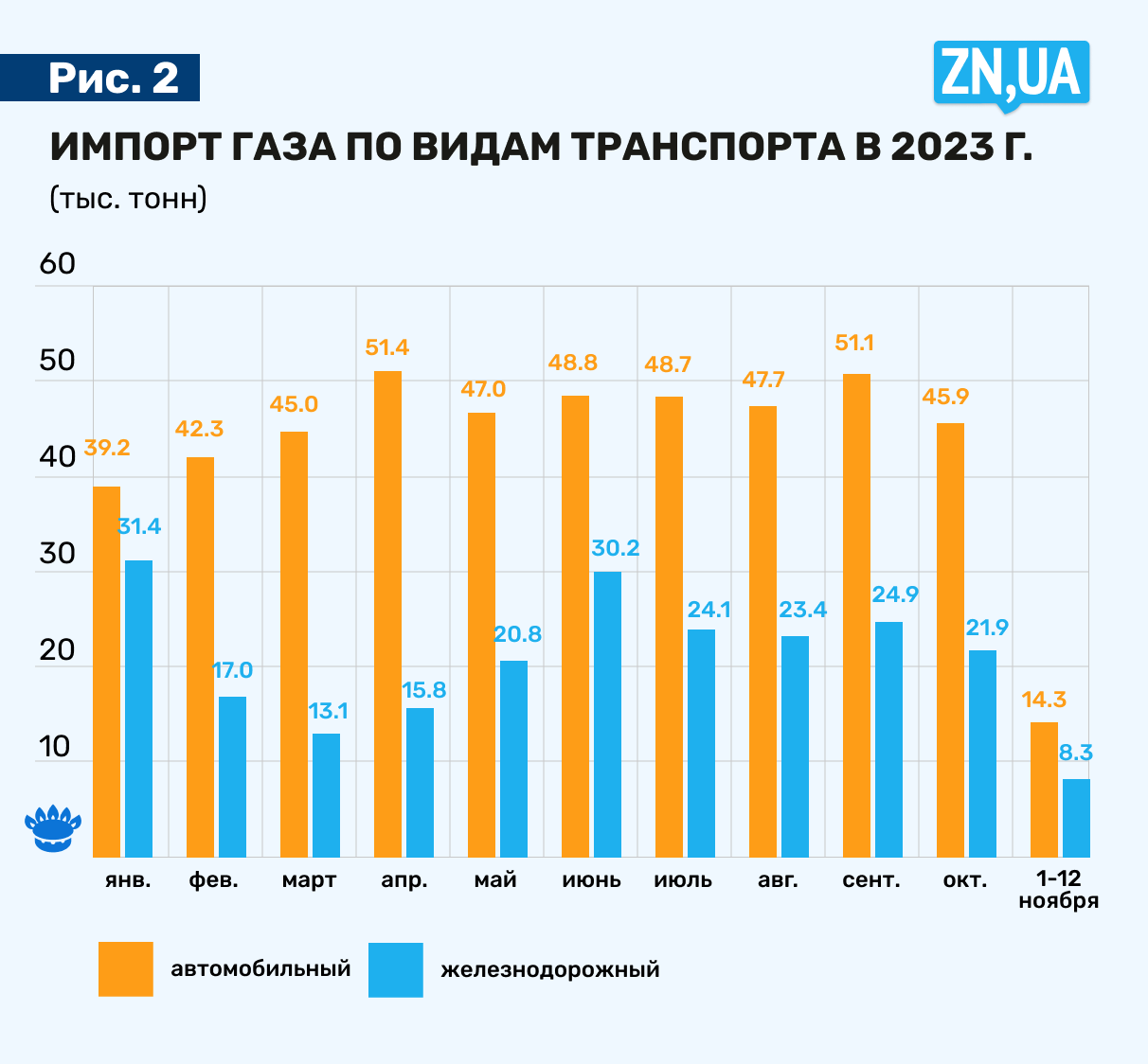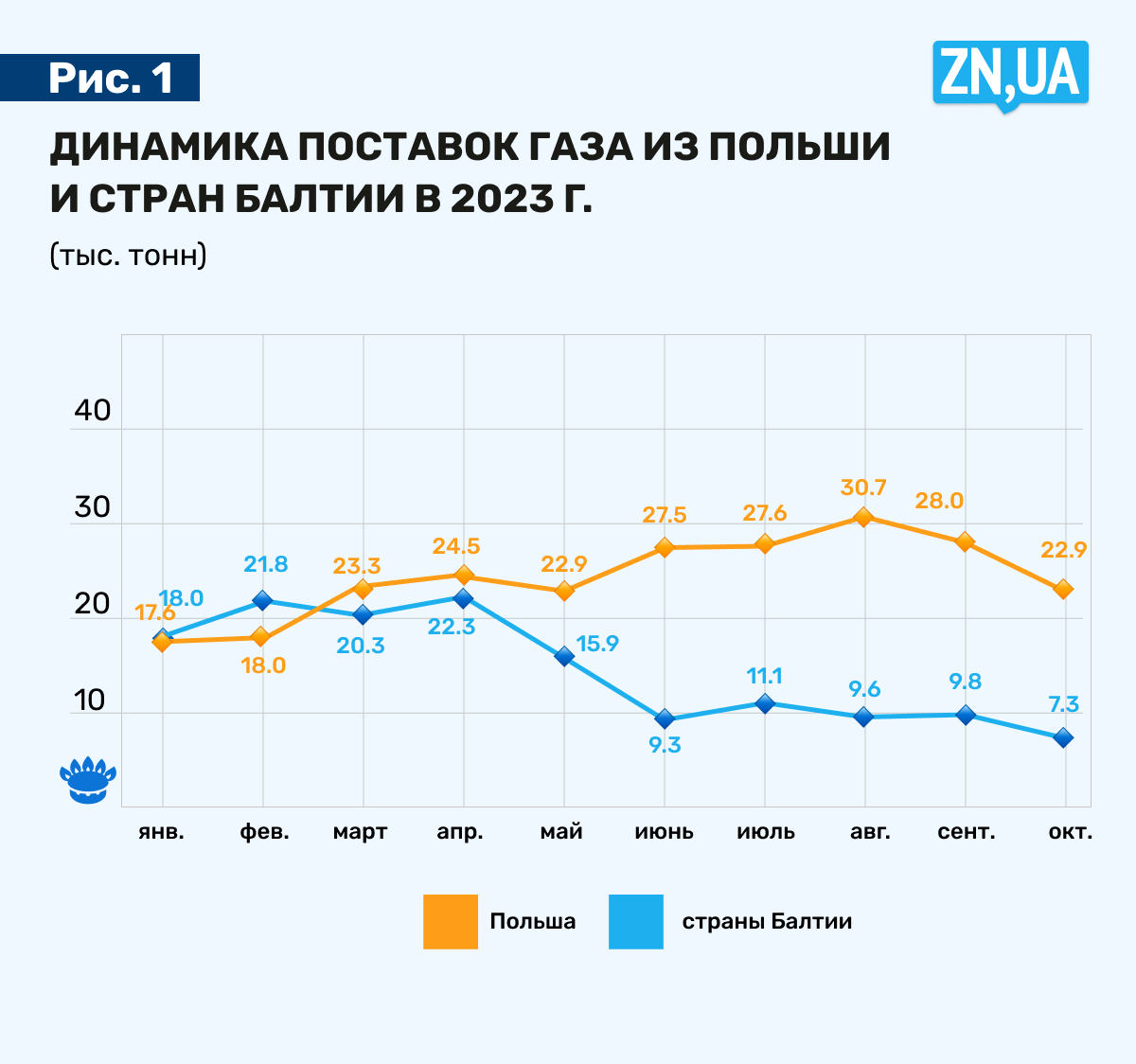 Итак, начиная с октября импорт газа из Польши и стран Балтии начал сокращаться (см. рис. 1). В среднем на протяжении девяти месяцев 2023 года с этих направлений было поставлено 52,7 тыс. тонн LPG в месяц, а в октябре уже 35,3 тыс. тонн.