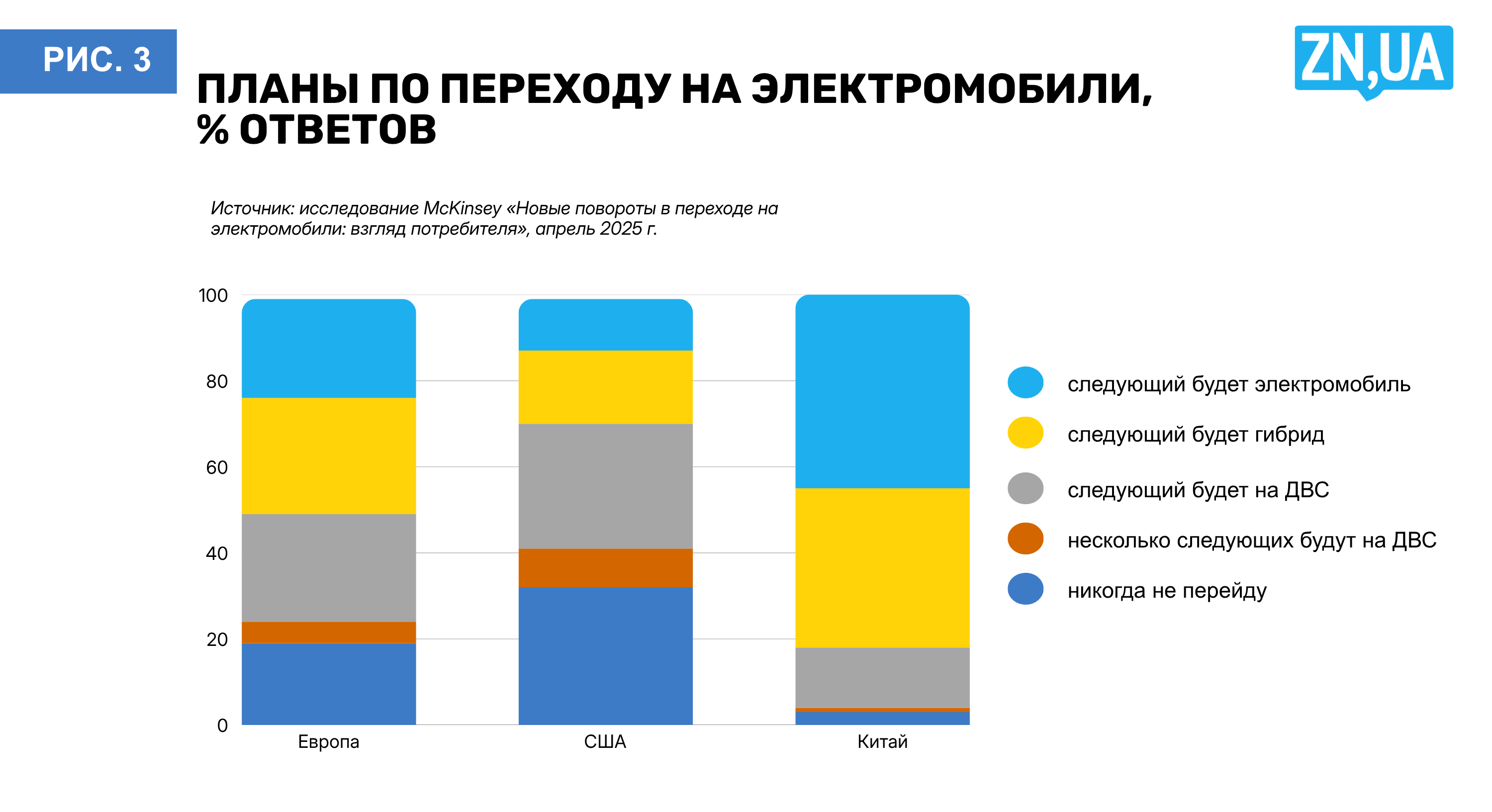 Сказать, что власть ЕС активно продвигает зеленые технологии в массы, тоже нельзя. Если экономичные двигатели внутреннего сгорания (ДВС) всегда пользовались мощными PR-программами, то «электрички» так активно не продвигаются. Согласно опросу в апреле 2025 года, около половины населения ЕС не видит себя владельцем EV в ближайшей перспективе (см. рис. 3). Показательны результаты США, где 32% респондентов заявили, что никогда не пересядут на электромобиль. Совсем другая картина в Китае — 45% опрошенных купят следующий автомобиль полностью электрический.