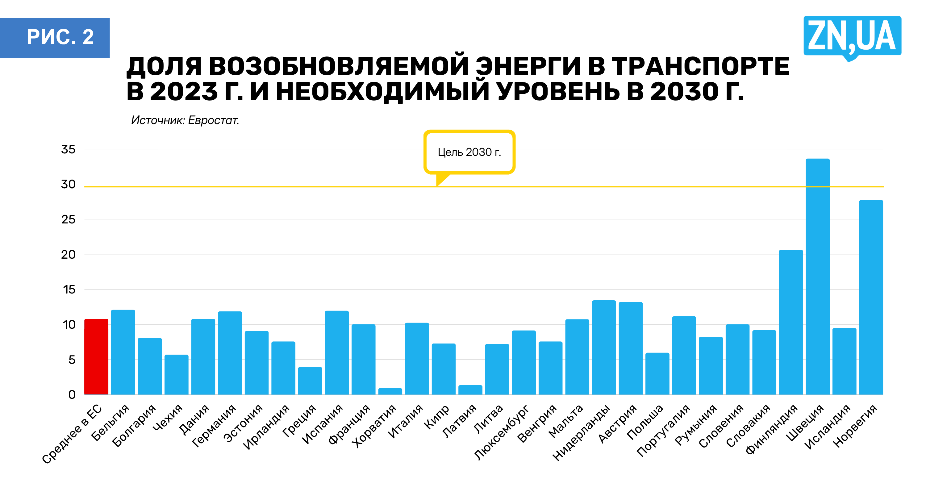 Еще глубже проблема на транспорте. В 2023 году (более свежих данных по ЕС еще нет) доля возобновляемой энергетики на транспорте составляла всего 10,8%, что почти втрое ниже плана на 2030 год (см. рис. 2). Доля сугубо батарейных электрокаров (BEV) в странах Восточной Европы колеблется в районе 0,5–2%, в Западной Европе приближается к 5–7%. Особняком стоят Скандинавские страны, которые десятилетиями развивали гидроэлектрические станции и сейчас имеют стабильную зеленую генерацию и надежные сети.