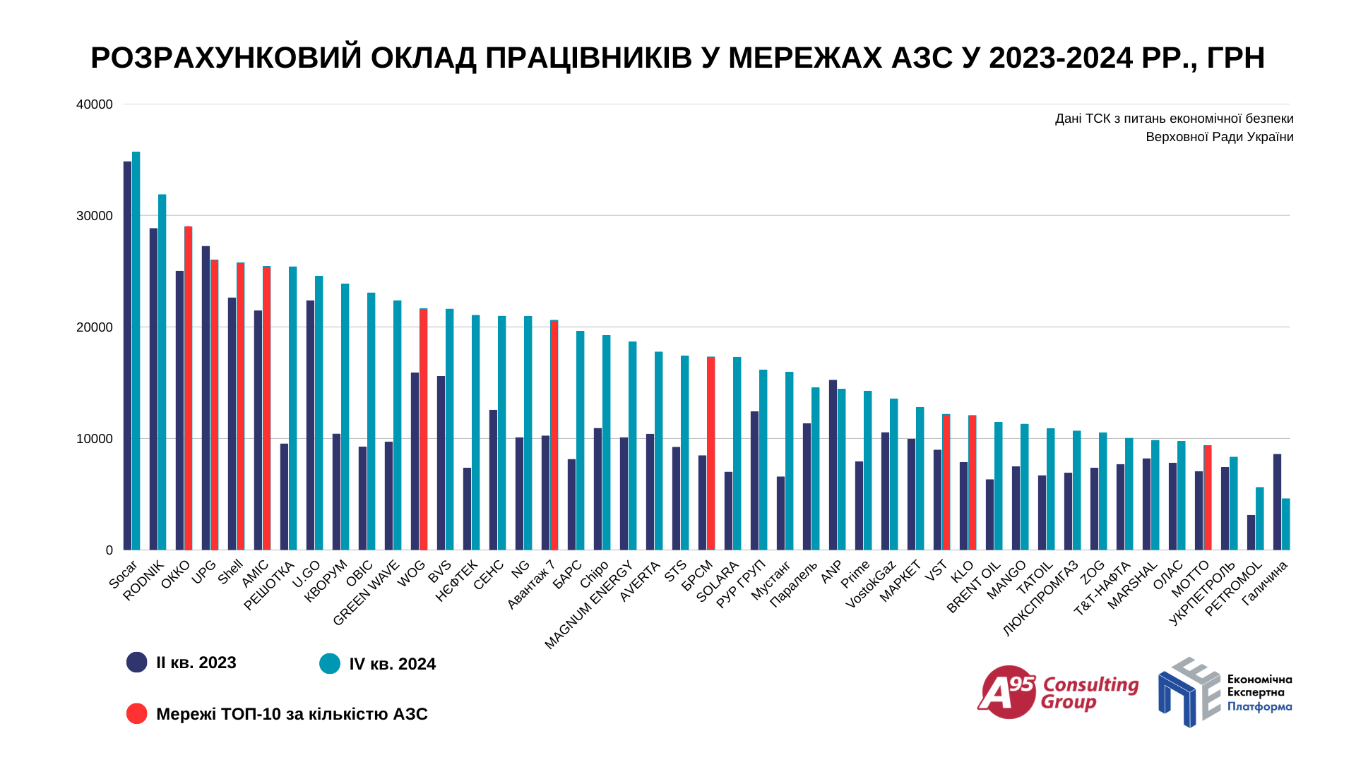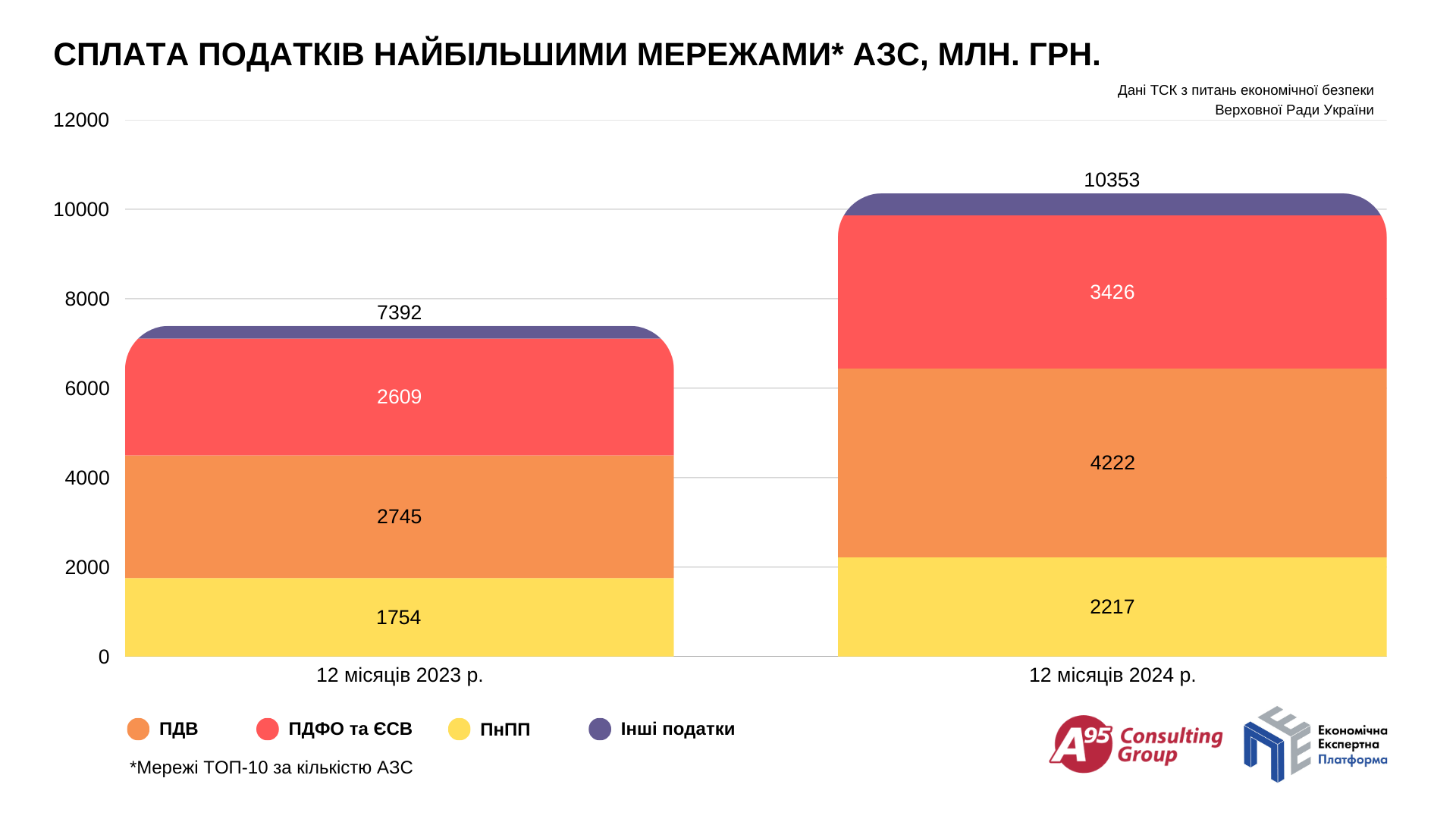 Налоговые платежи увеличились, несмотря на снижение розничных продаж на 2,9%. Так, ТОП-10 сетей по количеству заправочных станций, на которые приходится 54% продаж топлива в стране, в 2024 году уплатили на 38% больше «операционных» налогов — 10,35 млрд грн против 7,39 млрд годом ранее.