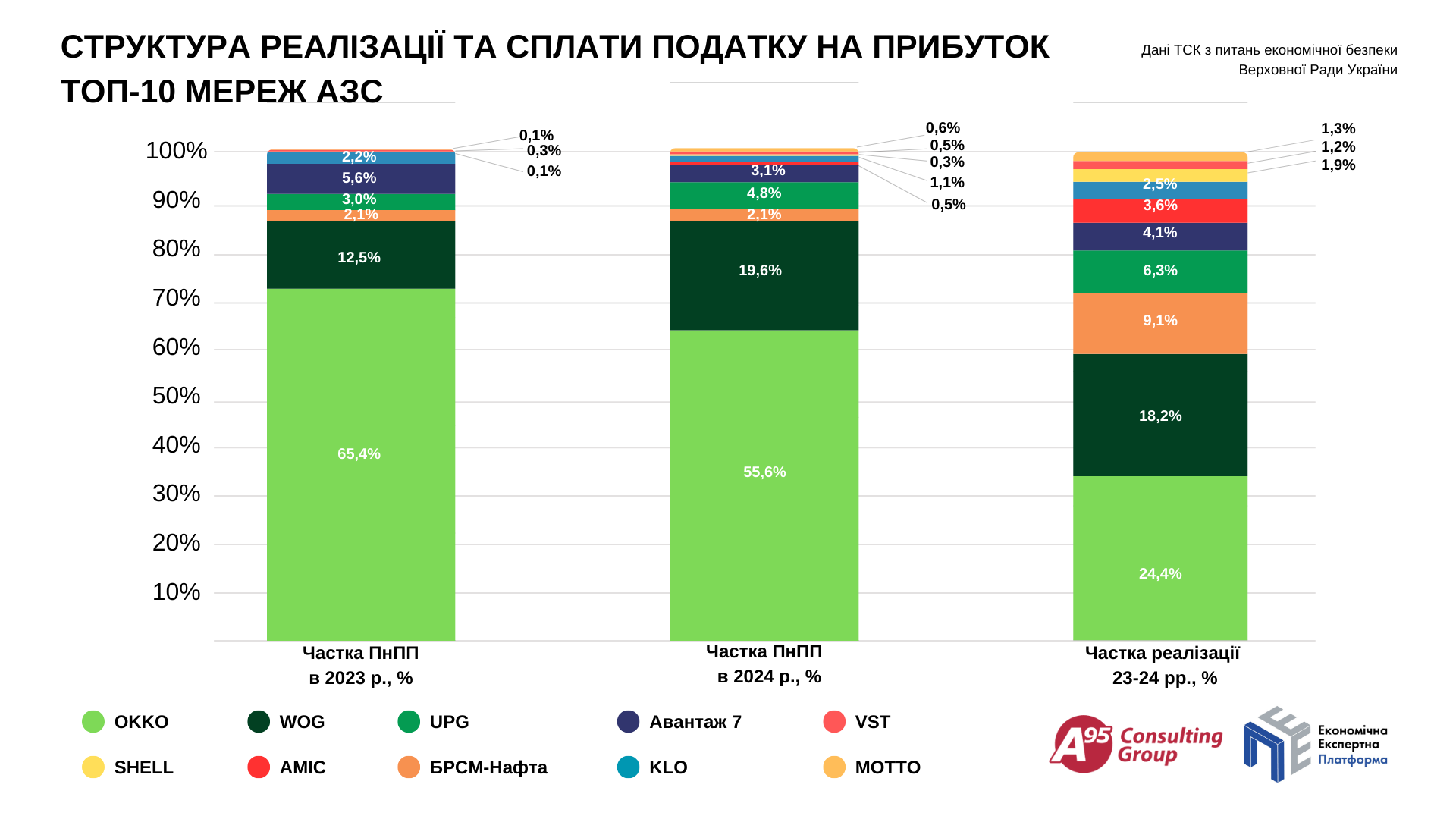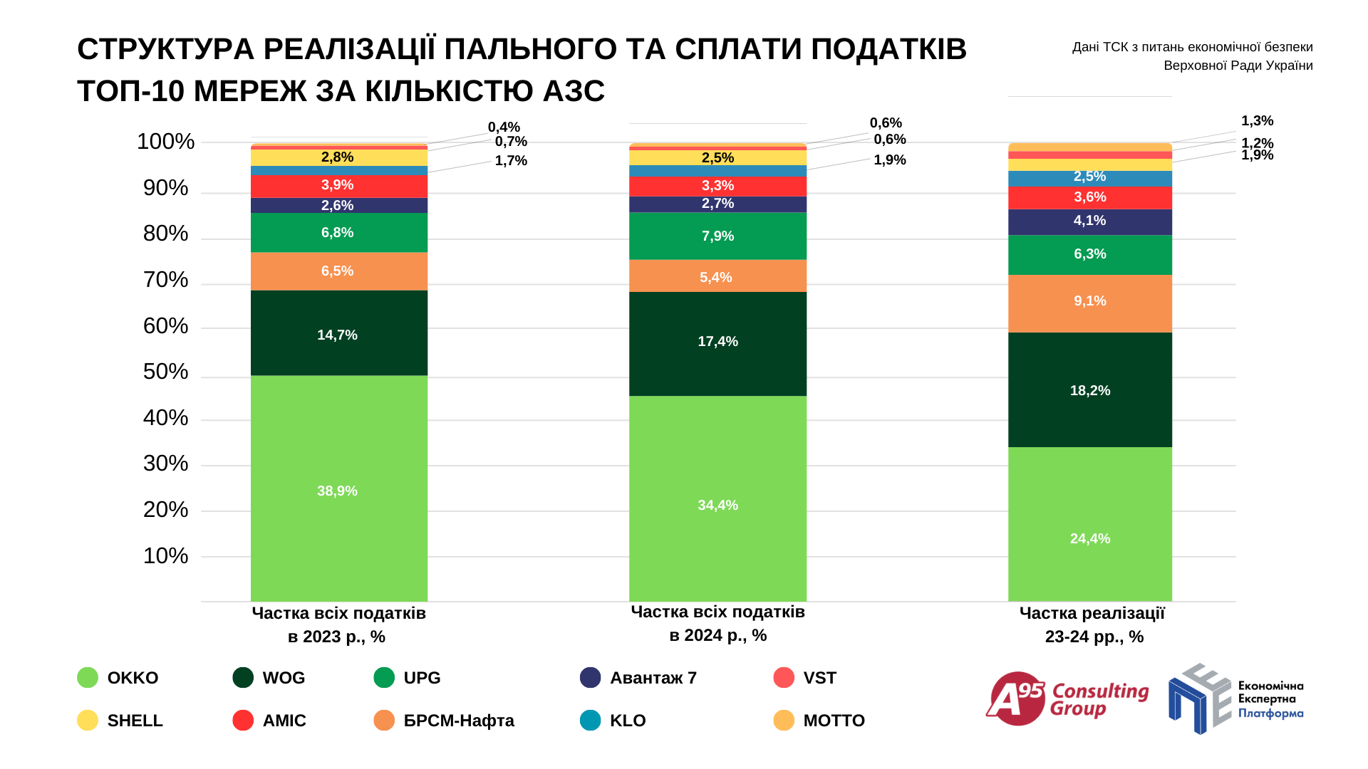 Основной «аномалией» остается крупнейший игрок рынка — ОККО. Сеть не просто продает самый большой объем топлива через свои комплексы, но и демонстрирует недостижимые «налоговые» показатели. Из вышеупомянутых 2,9 млрд грн, которые бюджет получил дополнительно с ТОП-10 в 2024-м, 980 млн пришлось на ОККО. Имея 24% реализации топлива сред ТОП-10 сетей, она обеспечила в прошлом году 35% общей уплаты налогов.