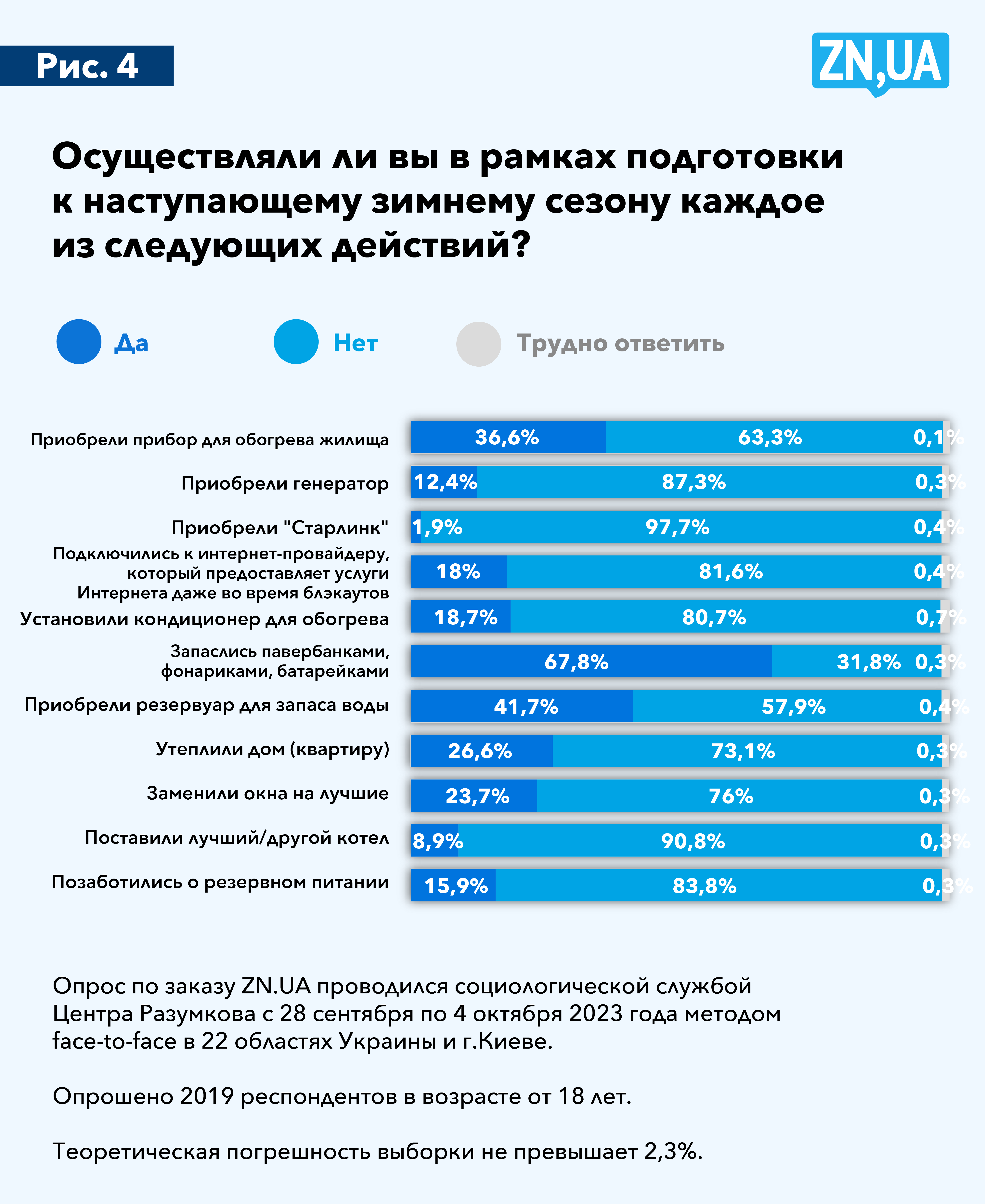 Тем не менее почти четверть опрошенных все же указали, что провели минимальную термомодернизацию: утеплили дом (квартиру) к зиме (26,6%) и заменили окна на лучшие (23,7%). Также 18,7% респондентов установили для обогрева кондиционер, 18% — перешли к интернет-провайдеру, который предоставляет услуги Интернета даже во время блэкаутов, 15,9% — приобрели прибор резервного питания, 12,4% — приобрели генератор, 8,9% — заменили котел на лучший. Всего 1,9% респондентов указали, что, готовясь к зиме, приобрели «Старлинк», что не удивляет, учитывая стоимость такой покупки.