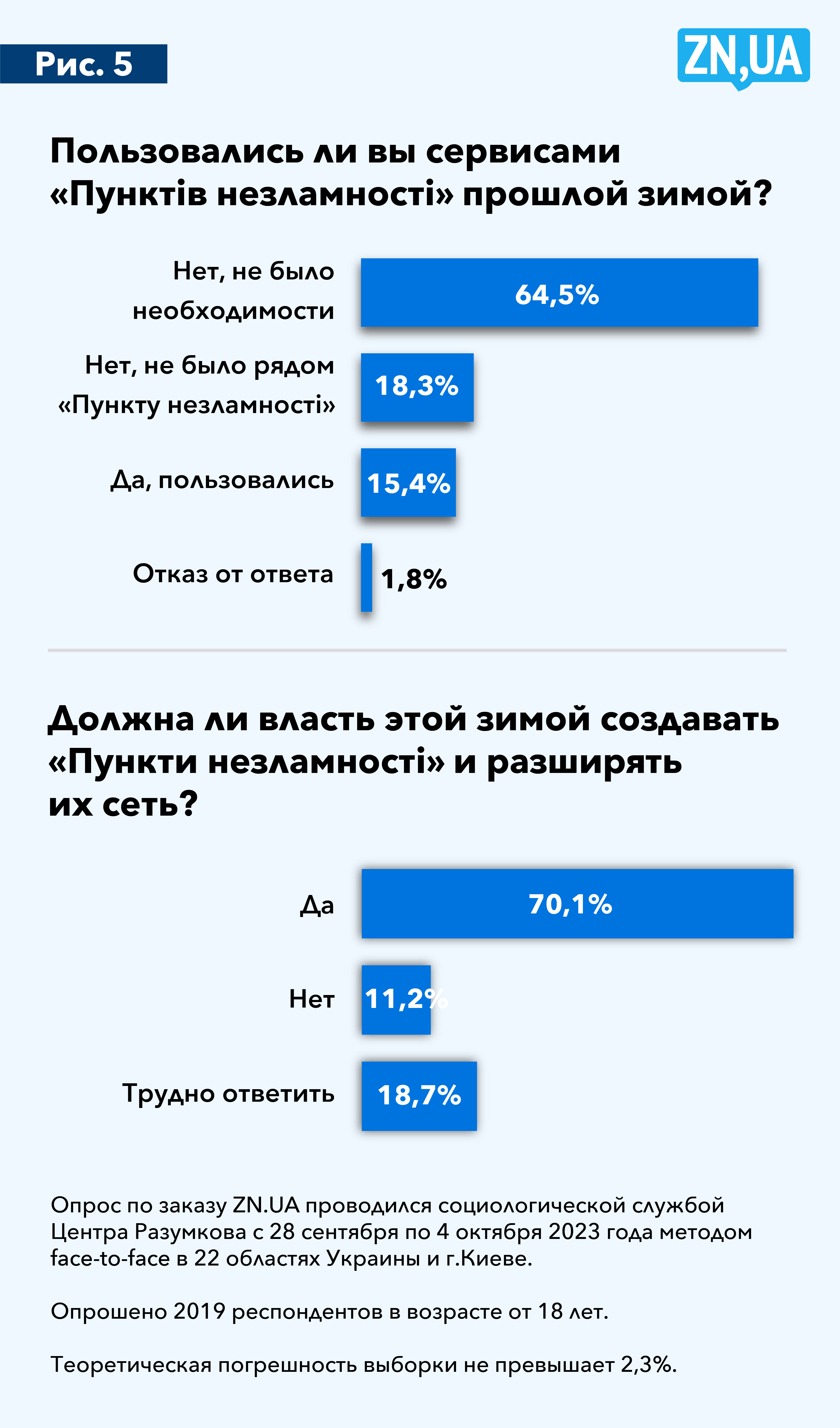 А вот отношение украинцев к «Пунктам незламності» откровенно удивило (см. рис. 5). С одной стороны, 64,5% респондентов ответили, что прошлой зимой не пользовались их сервисом, потому что не было такой необходимости. С другой — 70% указали, что власть должна этой зимой создавать «Пункти незламності» и расширять их сеть. Впрочем, это типичное украинское «най буде» имеет смысл, ведь шансов избежать дефицита энергетических мощностей у нас нет.