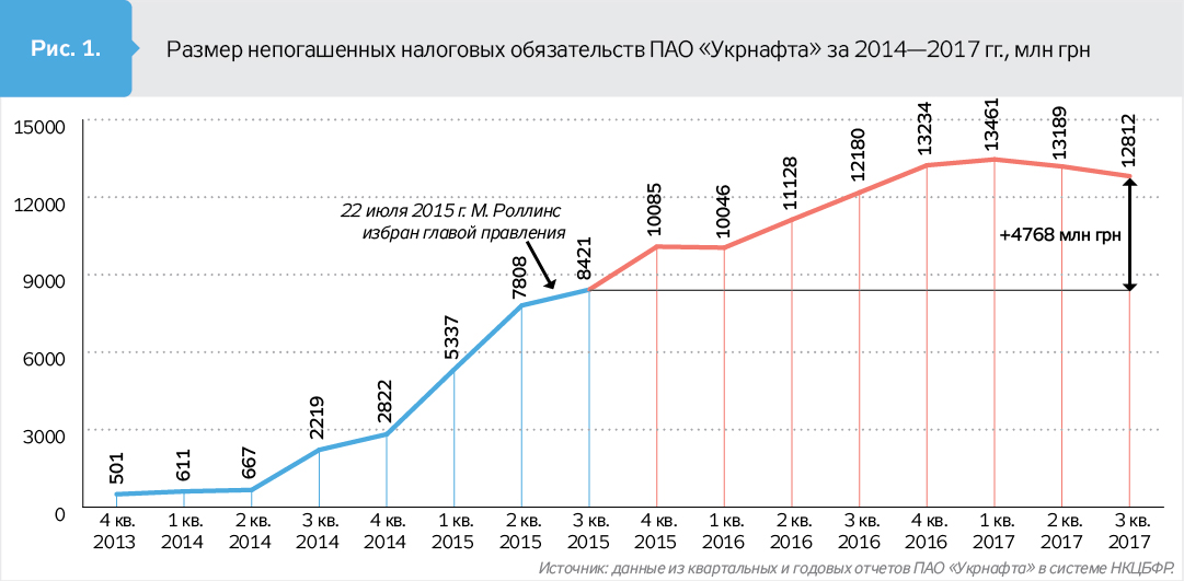 Вопрос продления лицензий упирается в налоговый долг, который руководство "Укрнафты" называет "историческим", хотя за время работы Роллинса он вырос наполовину (см. рис. 1). "Укрнафта" и Государственная фискальная служба не могут сойтись в оценках долга: Марк Роллинс называет цифру 11,8 млрд грн, ГФС - 13,9 млрд.