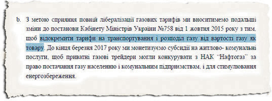 Кроме этого, подпунктом b пункта 33 раздела Е "Политика в энергетическом секторе" Меморандума об экономической и финансовой политике (Письмо о намерениях от 1 сентября 2016 г. №14168/0/2-16 президента Украины, правительства Украины и Национального банка Украины к Международному валютному фонду) указано, в частности, что с целью содействия полной либерализации газовых тарифов мы будем вносить дальнейшие изменения в постановление Кабинета министров Украины №758 от 1 октября 2015 г. с тем, чтобы разделить тарифы на транспортировку и распределение газа от стоимости газа как товара.