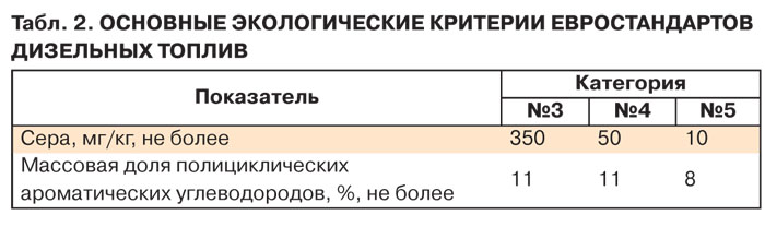 Евростандарты на бензины предусматривают снижение содержания ароматических соединений до 35% и соединений серы - до 10 мг/кг. Жесткие требования предъявляются к содержанию бензола: 5% - уже начиная с Евро-2 и далее - не более 1%. Бензол обладает высокой токсичностью и официально причислен МАИР (Международным агентством по изучению рака) к группе канцерогенов. В табл. 2 представлены основные экологические критерии евростандартов дизельных топлив.
