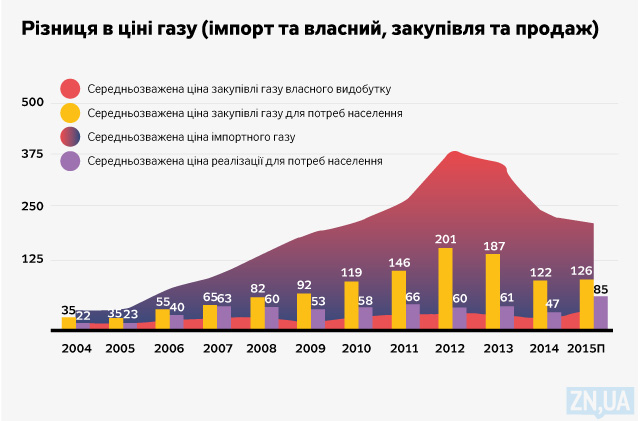 1. Разница между ценой реализации газа для населения и ТКЭ и ценой его покупки. В 2010–2013 гг. эта разница была особенно большой из-за завышенной цены российского газа - 2–4 млрд долл. в год. Кроме того, эта разница далеко не всегда вовремя покрывалась государством. Например, на начало 2015-го еще оставался объем непокрытой разницы за прошлые годы. Он зафиксирован в гривне по старому курсу. Когда и по какому курсу компания получит эти деньги, вопрос, очевидно, не к нам. В 2014 г. "Нафтогаз" понес 28 млрд грн убытков от реализации газа населению и ТКЭ ниже цены закупки, в первом квартале 2015 г. - 10,5 млрд грн.