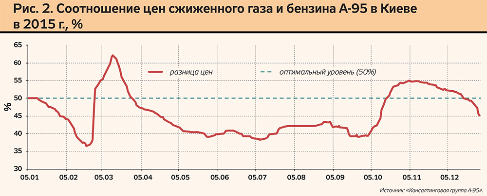 "Золотое правило" автогаза гласит, что его цена не должна превышать 50% цены бензина. Поэтому когда в Украине в отдельных регионах отношение опускалось порой до 35%, успех газу был обеспечен (рис. 2).