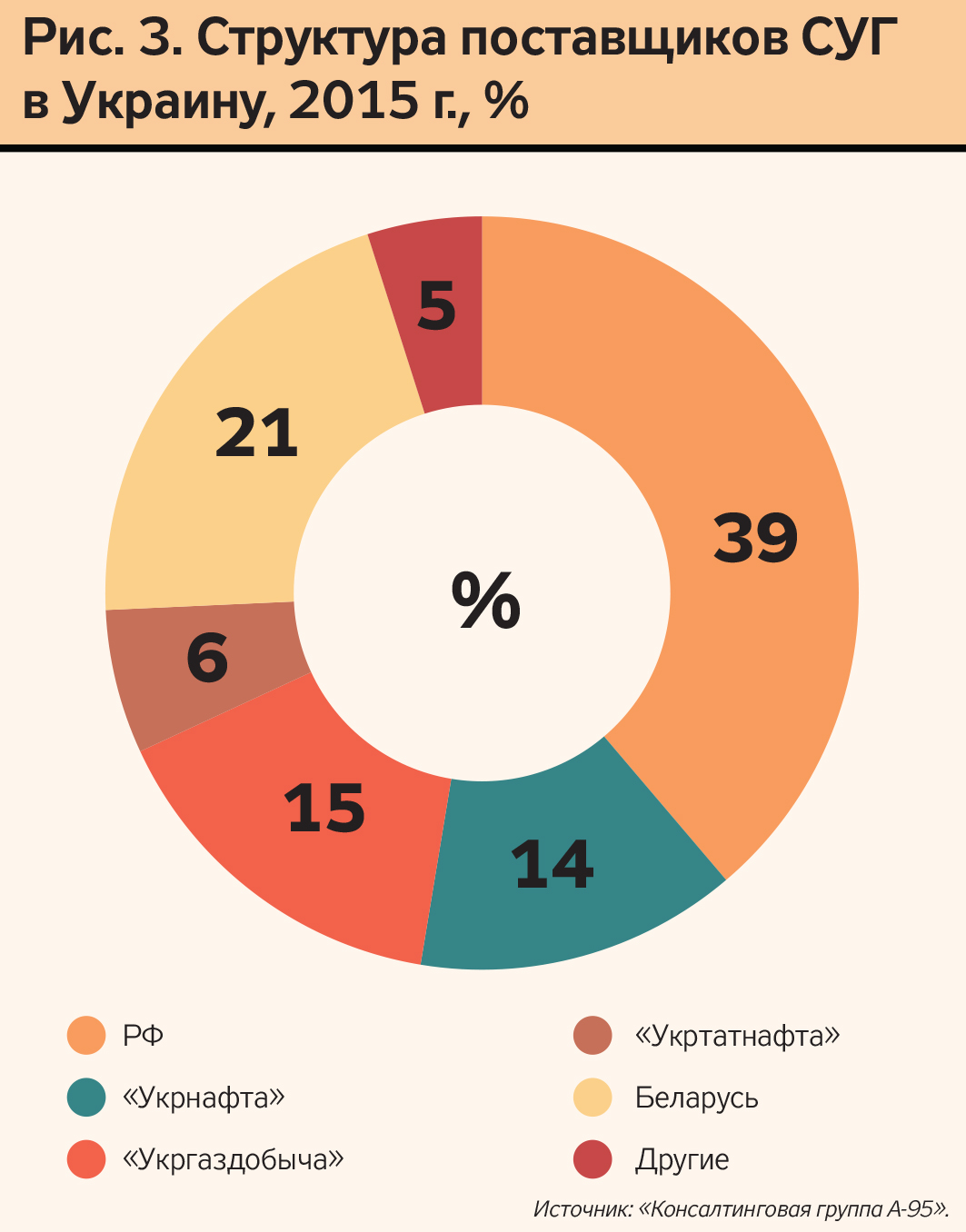 Последние годы характеризуются падением отечественного производства газа, и 2015-й не стал исключением. И если "Укрнафта" удержала падение производства СУГ в рамках 6% (до 154,15 тыс. т в 2015 г.), то "Укргаздобыча" "уронила" этот показатель до 13% (до 172,63 тыс. т). Уже девятый год кряду растущий спрос на СУГ удовлетворяют импортные поставки. По итогам 2015 г. на импорт приходится более 63%, а в пиковые месяцы его доля превышала 70%. Основные источники снабжения рынка пока остаются в РФ и Беларуси. Еще в 2014 г. обогнав по объемам крупнейшего украинского производителя - "Укргаздобычу", россияне в 2015 г. активизировались, увеличив поставки СУГ на 53%. Благодаря такому росту доля россиян на украинском рынке возросла с 30% в 2014-м до почти 40% в 2015-м (рис. 3).