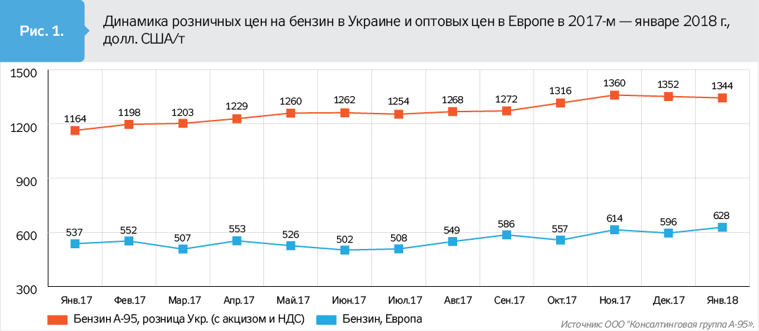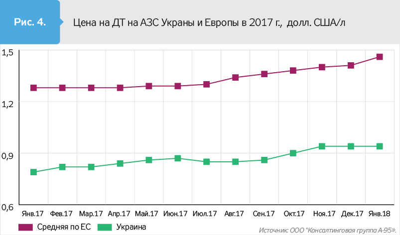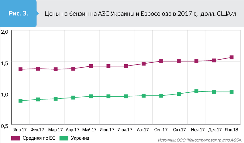 Признаками сговоров и злоупотреблений является нелогичное поведение участников рынка и рост торговой наценки. Мы уже установили, что в 2017 г. розничный рынок полностью дублировал динамику мирового рынка нефтепродуктов. Сравнение с ценами на заправках Евросоюза показывает ту же адекватность.