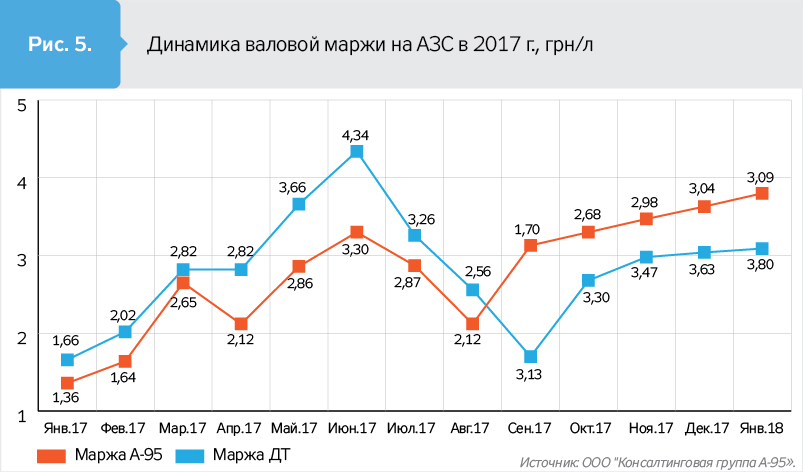 Что касается торговой наценки, то в отличие от мутной себестоимости электроэнергии, в случае с нефтепродуктами все понятно - есть четкие ориентиры (мировые котировки), известны ставки налогов и цены реализации. Посчитать заработки АЗС несложно. В 2017 г. "грязная" наценка составила в среднем 10 центов, или до 3 грн, на литре как бензина, так и дизтоплива.