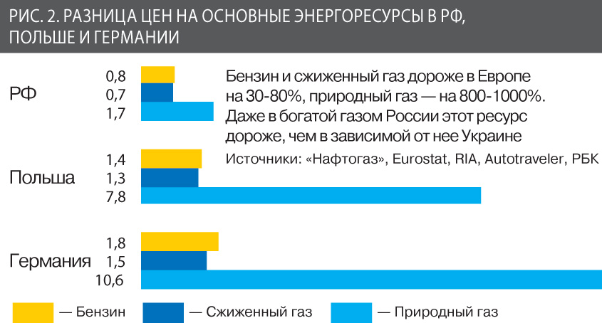 Рассмотрим по категориям. Что касается населения, то цены в этом сегменте потребления у нас остаются рекордно низкими. Дешевле, чем в России, не говоря о странах Восточной Европы, которые давно прошли этот путь. Особенно показательно сравнение цены газа и других энергоносителей. Наши потребители давно привыкли к рыночной цене бензина и пропан-бутана, но метан (тот самый природный газ, который идет по трубам) отстает кардинально (см. рис.1).