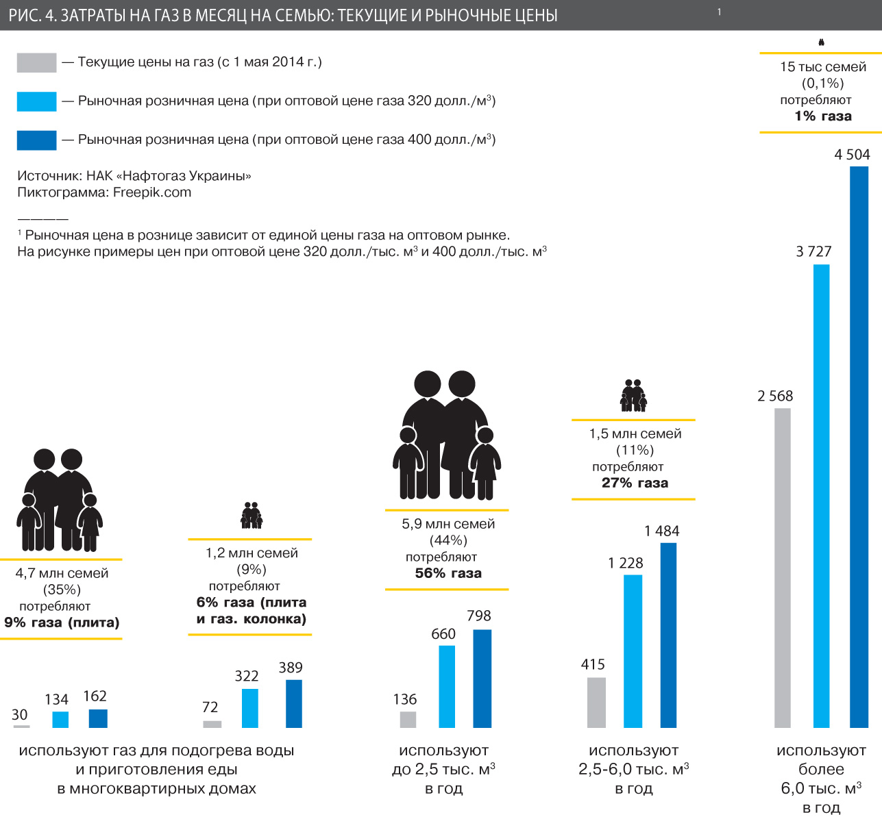 30 грн в месяц. Это каждый третий потребитель газа, предназначенного для населения. Если реализовать наши предложения, то затраты одного домохозяйства на газ возрастут до 134–162 грн в месяц(см. рис. 4). Это меньше, чем затраты средней семьи на такие статьи расходов, как мобильная связь, алкоголь или табак. Есть аспект социальной справедливости: в Украине множество домохозяйств в удаленных негазифицированных районах - не самое зажиточное население. Они вынуждены использовать сжиженный газ, пропан-бутан, и их среднемесячные расходы на покупку газа в баллонах на приготовление пищи уже давно перевалили за 170 грн в месяц. Получается, что низкими тарифами на природный газ из трубы мы дискриминируем эту категорию потребителей, которые, как правило, и являются наименее защищенными. При этом всем остальным, включая и небедное население городов, мы этот газ практически дарим. Непозволительная расточительность.
