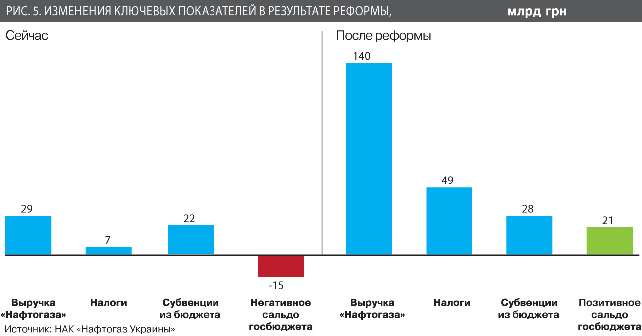 Тут уместно будет вспомнить о механизме льгот и субсидий, который компенсирует все затраты малообеспеченных потребителей выше определенного уровня. Мы осознаем, что после роста цен количество обращений за субсидиями увеличится и затраты бюджета вырастут. Тем не менее бюджет перестанет тратить десятки миллиардов гривен на поддержку "Нафтогаза" и начнет, наоборот, получать деньги. По нашим расчетам, если все имеющие право на субсидию обратятся за ней, то бюджет все равно останется с прибылью. Речь идет о позитивном сальдо для бюджета на 36 млрд грн в год (!) (см. рис. 5). Эти деньги государство получит в виде дополнительных налогов (ренты, НДС, налога на прибыль) и сможет потратить на финансирование энергоэффективности, что в итоге приведет к снижению объемов потребления газа, а соответственно, к последующему уменьшению расходов потребителей.