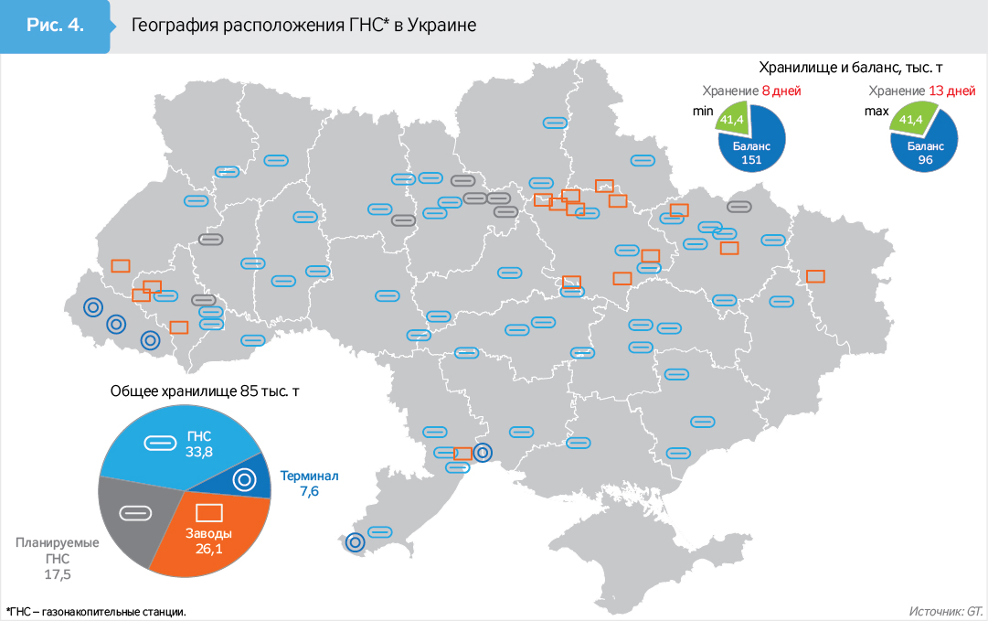 Проведенный GT Group анализ показывает, что недостатка хранилищ СУГ как такового в Украине нет. "Мощностей хранения в Украине с учетом тех хранилищ, что уже запланированы или строятся, хватает. Другой вопрос - неравномерность их размещения в стране и низкая эффективность их использования", - считает Колодяжный.