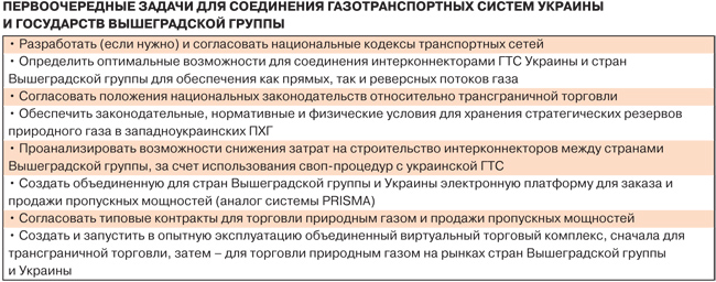 Вывод первый. Необходимо объединить усилия стран V4 и Украины в разработке в соответствии с требованиями Третьего энергетического пакета единой нормативной базы, регламентирующей функционирование газовых рынков, принять общую дорожную карту проведения таких работ (в табл. названы первоочередные работы, которые необходимо учесть в этой общей со странами V4 дорожной карте).