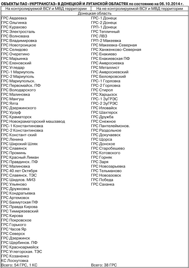 По состоянию на 6 октября, украинский оператор ГТС - ПАО "Укртрансгаз", а точнее, его региональное подразделение "Донбасстрансгаз" в Донецкой области, а точнее, на контролируемой Вооруженными силами Украины и МВС территории, имеет доступ и контролирует работу 54 газораспределительных станций (ГРС). Обеспечивает общий суточный объем потребления этой территории в 3,786 млн кубометров газа, из которых промышленные потребители используют 2,223 млн, население - 1,563 млн. Подконтрольна также одна компрессорная станция (КС) Лоскутовка.