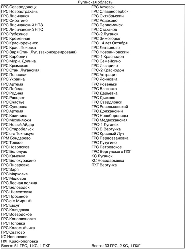 В Луганской области на контролируемой Вооруженными силами Украины и МВС территории расположена 51 ГРС, а также компрессорная станция Новопсков и ПХГ Краснопоповка. Общий суточный объем потребления -