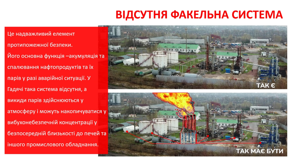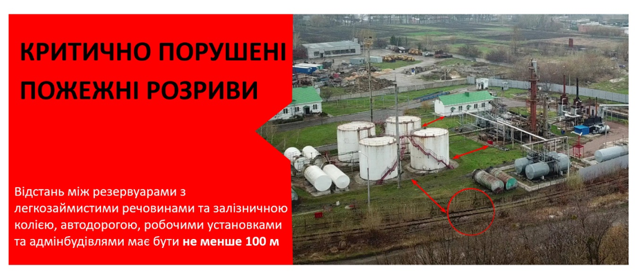 Расстояния на этом чудо-заводе — одна большая боль. Согласно действующим нормам, а именно — ведомственным указаниям по противопожарному проектированию предприятий, зданий и сооружений нефтеперерабатывающей и нефтехимической промышленности (ВУПП-88), расстояние от резервуарной группы до железной дороги и производственных установок должно быть не менее 100 м, до вспомогательных зданий — 30 м. Даже с высоты дрона видно, что в Гадяче это нормы грубо нарушены.