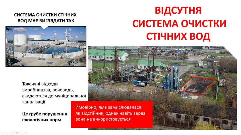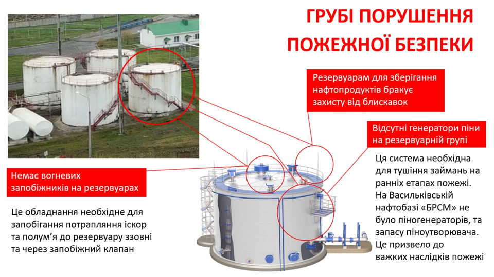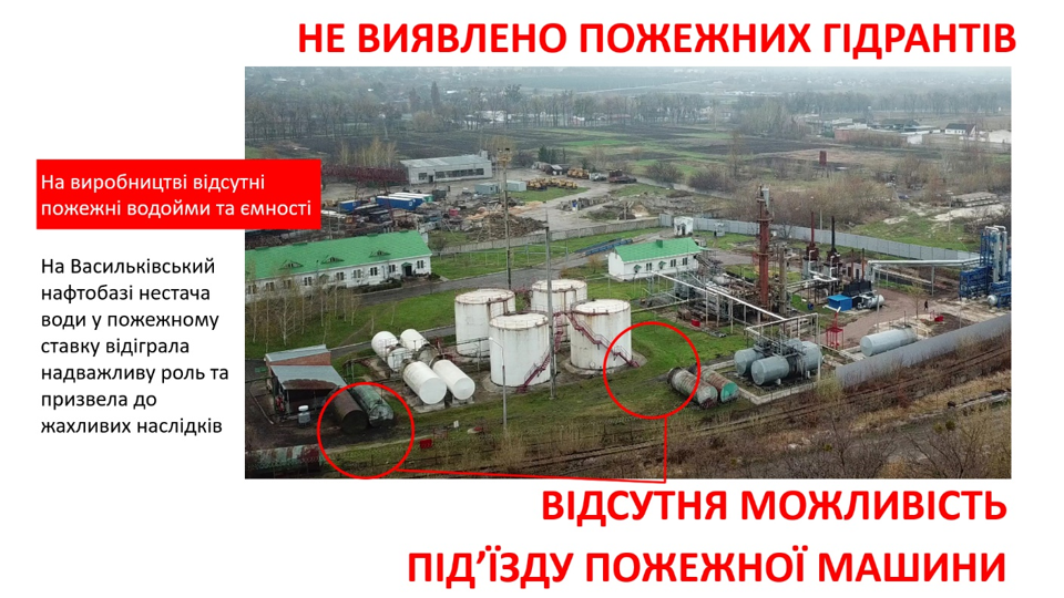 Эксперты также обращают внимание на неудовлетворительное состояние обваловки резервуарного парка. В случае аварийного разлива топливо может неконтролируемо растечься. Отметим, что одним из критических моментов Васильковской трагедии стало стекание топлива в пожарный пруд, из-за чего стало невозможно использовать воду для тушения пожара.