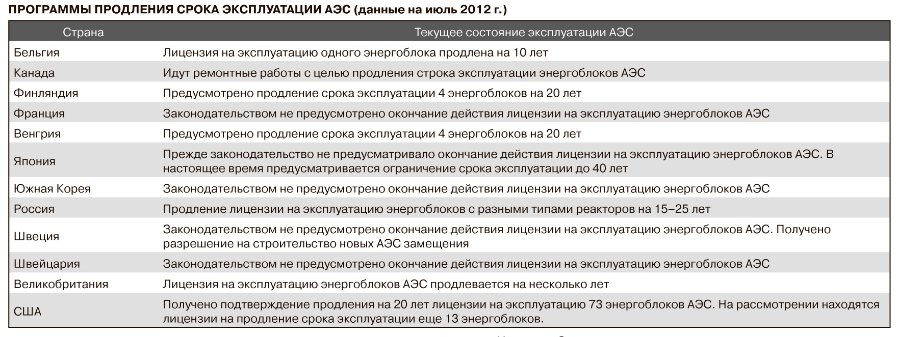 В мире продление срока эксплуатации энергоблоков - уже устоявшаяся практика. По состоянию на июль 2012 г., аналогичные решения принимали Франция, Финляндия, Венгрия, Япония, Россия и США. А в некоторых странах вообще на законодательном уровне не предусмотрено окончание действия лицензии на эксплуатацию АЭС (см. табл.). Экономический анализ, проводимый Агентством по атомной энергетике при ОЭСР, показал, что почти во всех случаях продление срока эксплуатации АЭС хотя бы на десять лет является экономически выгодным.