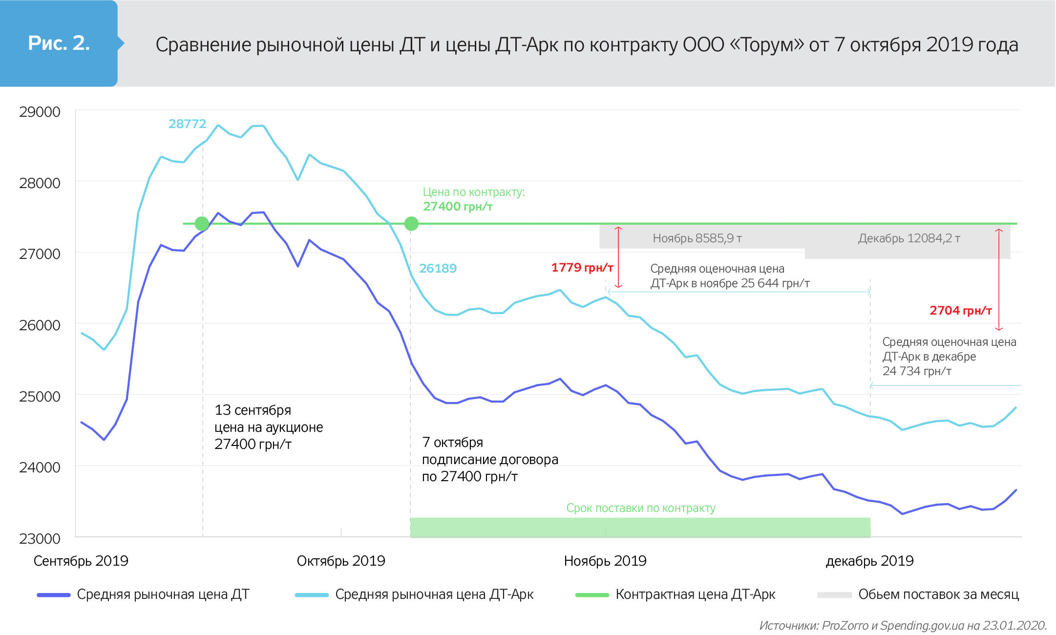 В обозначенный контрактом срок, до 29 ноября, было отгружено 8596 из 25415 тонн. На сайте ProZorro, где Минобороны обязано публиковать любые изменения к контрактам, нет допсоглашения ни о продлении сроков, ни о пересмотре цены. В итоге в декабре, когда рыночные цены провалились еще сильнее, "Торум" отгрузил Минобороны еще 12084 тонны дизельного топлива по 27400 гривен/тонна при рыночной цене в 25515 гривен/тонна (см. рис. 2).