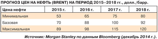 Для этого воспользуемся прогнозами Всемирного банка, Bloomberg и Morgan Stanley. В таблице приведен рассчитанный Morgan Stanley по данным Bloomberg (декабрь 2014 г.) прогноз цен на нефть (Brent) на период 2015–2018 гг.