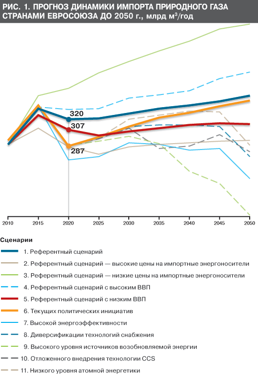 Так, за исключением крайних референтных сценариев, приведенных экспертами ЕС, объем импорта природного газа в Евросоюз согласно первому, пятому и шестому референтным сценариям будет колебаться в пределах 287–320 млрд кубометров в год. То есть динамика импорта природного газа в страны ЕС ненамного изменится с учетом того, что дополнительных мер для этого не требуется. Они понадобятся разве что при шестом сценарии, который нуждается во внедрении дополнительных мер в виде политических законодательных инициатив (см. табл.). В частности, разработки стратегии для стран Евросоюза "Энергетика 2020" с учетом принятия и осуществления дополнительных энергоэффективных мер. Каких именно, каждая страна - потребитель природного газа будет определять отдельно с учетом своих национальных интересов и энергетических потребностей в рамках общеевропейской стратегии рационального энергопотребления и диверсификации источников энергоснабжения.