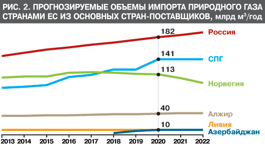 Как это может происходить, показано на рис. 2, где представлен прогноз объемов импорта природного газа странами Евросоюза из основных стран-поставщиков.