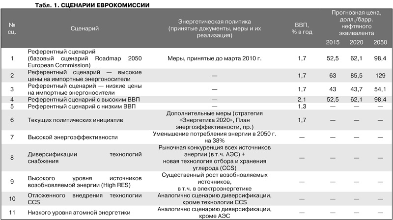 На рис. 1 приведена прогнозная динамика импорта природного газа странами Евросоюза до 2050 г. по разным сценариям, сформулированным Европейской комиссией. Эти данные свидетельствуют, что почти по всем основным сценариям эксперты Еврокомиссии прогнозируют в течение пяти лет (в 2015–2020 гг.) снижение объемов импорта природного газа. Особенно в условиях применения дополнительных мер, в частности мер по энергосбережению, и при условии срабатывания отдельных факторов, оказывающих непосредственное влияние на цену газа, в частности на цену в долларах за баррель в нефтяном эквиваленте. Ведь почти все долгосрочные контракты, например, с российским "Газпромом", в той или иной степени завязаны на нефтяные цены, или цены нефтяного эквивалента. (Тезисное объяснение и обоснование сценариев Еврокомиссии приведены в табл.) Это может также означать, что страны ЕС, имеющие долгосрочные контракты с российским "Газпромом" и норвежским Statoil, будут добиваться пересмотра определенных положений этих контрактов (собственно, многие из них согласовали с "Газпромом" снижение цены без пересмотра принципиальных положений долгосрочных контрактов).
