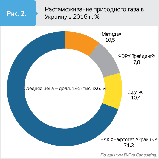 Объемы и доля импорта частными трейдерами стремительно растут. Крупнейшие частные импортеры в 2016 г.: "Метида" - более 1 млрд кубометров (10% всего импорта) и "ЕРУ трейдинг" - 0,8 млрд (8%).