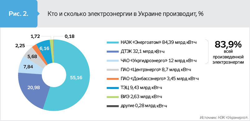 На энергорынке три основных производителя электроэнергии, доля которых в общем энергобалансе составляет почти 84%, - НАЭК "Энергоатом", ДТЭК и "Укргидроэнерго", - также фактически доминируют в генерации (см. рис. 2).