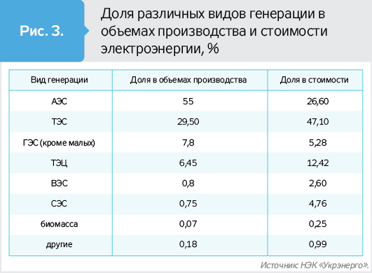 При этом доли основной генерации электроэнергии значительно отличаются при сравнении их стоимости. Например, доля государственного "Энергоатома" в общем объеме производства электроэнергии составляет в среднем по году 55%, а вот стоимость произведенной АЭС энергии - всего 26,6%. В то время как доля ДТЭК Рината Ахметова в общем производстве (именно им принадлежит большинство ТЭС) равна 29,5%, а стоимость - 47,1% (см. рис. 3).