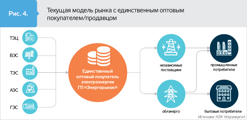 Уже больше 15 лет рынок энергопоставок Украины работает, как в свое время рынок Великобритании, по образу и подобию которого его создавали. То есть как своеобразный пул или, точнее сказать, как рынок единого покупателя и продавца. Это означает, что все производители электроэнергии (генерация) продают всю выработанную электроэнергию госпредприятию (ГП) "Энергорынок". Тарифы для каждого производителя устанавливает НКРЭКУ. ГП "Энергорынок" из общего объема продавало энергию тогдашним облэнерго (тарифы для которых также устанавливала НКРЭКУ). Облэнерго были и операторами распределительных систем (как до недавних пор на рынке газа облгазы), и поставщиками электроэнергии непосредственно потребителям (см. рис. 4).
