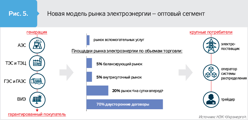 Как будет работать новая модель рынка электроэнергии в оптовом сегменте (см. рис. 5), на самом деле покажет практика. И очень скоро. Но идея такова: рынок двусторонних контрактов (наиболее прогнозируемый и стабильный для поставщиков, потребителей и операторов сети передачи и распределения) должен составить не менее 70%. И это будет самая дешевая электроэнергия. Если у вас случился перебор/недобор, тогда докупаете/продаете на внутрисуточном рынке (с лагом в два часа, что уже дороже) или рынке "на сутки вперед", что еще дороже. Самыми дорогими будут балансирующий рынок и рынок вспомогательных услуг. Здесь и смогут заработать "Укргидроэнерго" и ДТЭК, поставляя энергию в часы пик для объединенной энергосистемы (ОЭС), разумеется, по самой высокой цене.