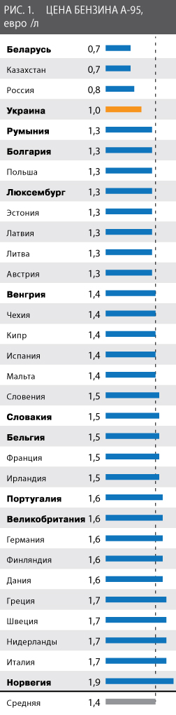 Такой разницей в налогах и объясняется тот факт, что цены в Украине самые низкие на континенте (см. рис.2). Дешевле только в странах Таможенного союза, где цены на нефть искусственно занижены для внутренних производителей. Кроме того, в Беларуси топливо на АЗС регулируется государством, а если точнее, дотируется за счет экспорта топлива из республики. Между тем налоги в России и на бензин, и на дизтопливо выше, чем в Украине. Выше украинского и белорусский акциз на дизтопливо.