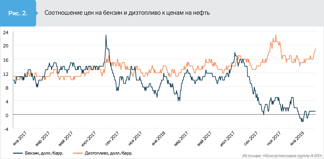 Процесс пошел, и он уже здесь. Со второй половины 2018-го цены на дизтопливо и бензин А-95 на украинских АЗС сравнялись. Причина - рост цен на дизтопливо в мире как следствие высокого спроса (см. рис. 2). Вне всякого сомнения, дизтопливо будет дорожать и далее, это пророчат на любой международной "нефтяной" конференции.