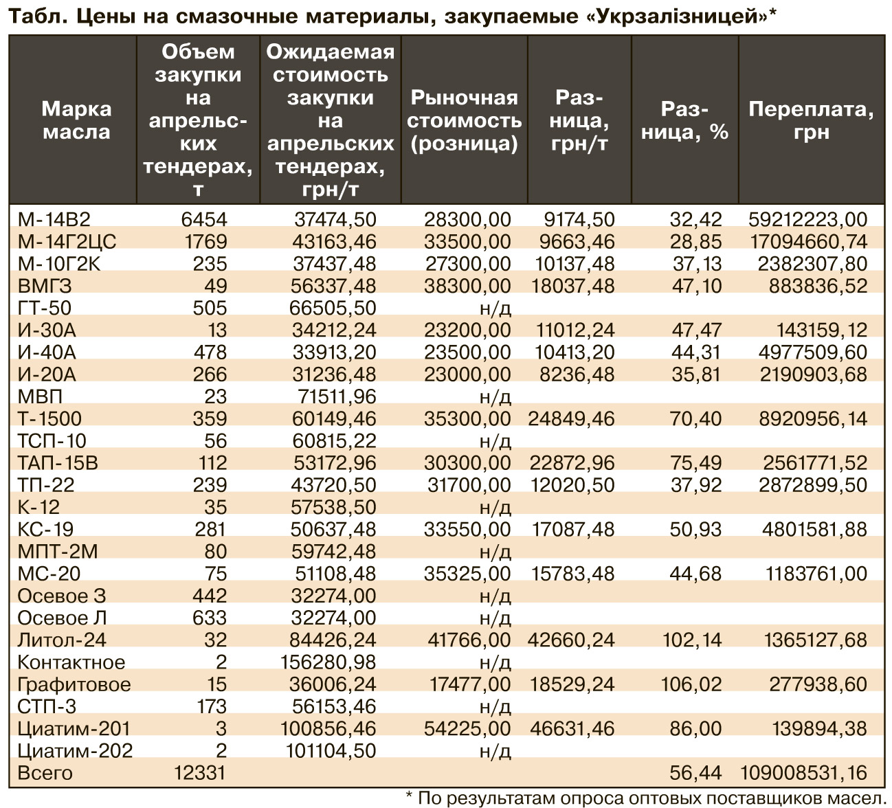 Особенность рынка смазочных материалов - в огромной номенклатуре (только УЗ закупает 32 наименования) и отсутствии системных данных о ценах по этим позициям. Например, найти в открытых источниках данные о ценах на дизтопливо или бензин не составляет труда, а вот аналогичную информацию по маслам раздобыть сложно. Но можно. Если засесть за телефон и компьютер с Интернетом на целый день, можно получить неплохое представление об уровне цен. Учитывая, что только на апрельском тендере УЗ готовилась потратить 534 млн грн, перевозчик мог бы выделить один день на мониторинг или заказать его специалистам (см. табл.).