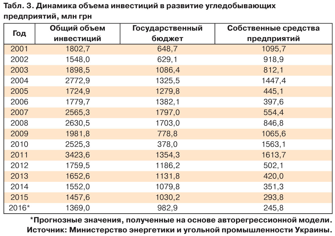 За 2001–2015 гг. общий объем инвестиций в деятельность угледобывающих предприятий сократился на 19,1% в результате уменьшения собственных источников предприятий на 73,2%. До 2007 г. наблюдалась тенденция роста объема инвестирования угольной промышленности за счет средств госбюджета, которая с 2008 г. из-за финансово-экономического кризиса изменилась на противоположную.